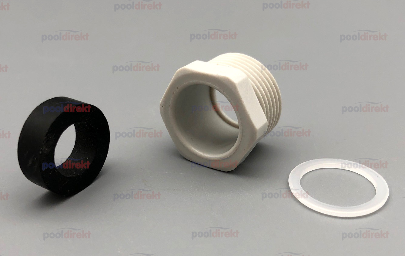 Zum Abdichten des stromführenden Kabels, welches in die Lampenkappe des Unterwasserscheinwerfers Neptun durch diese Halbverschraubung (Gewindegröße PG 13,5) hindurch eingefädelt und an der Kappe angeschraubt wird.