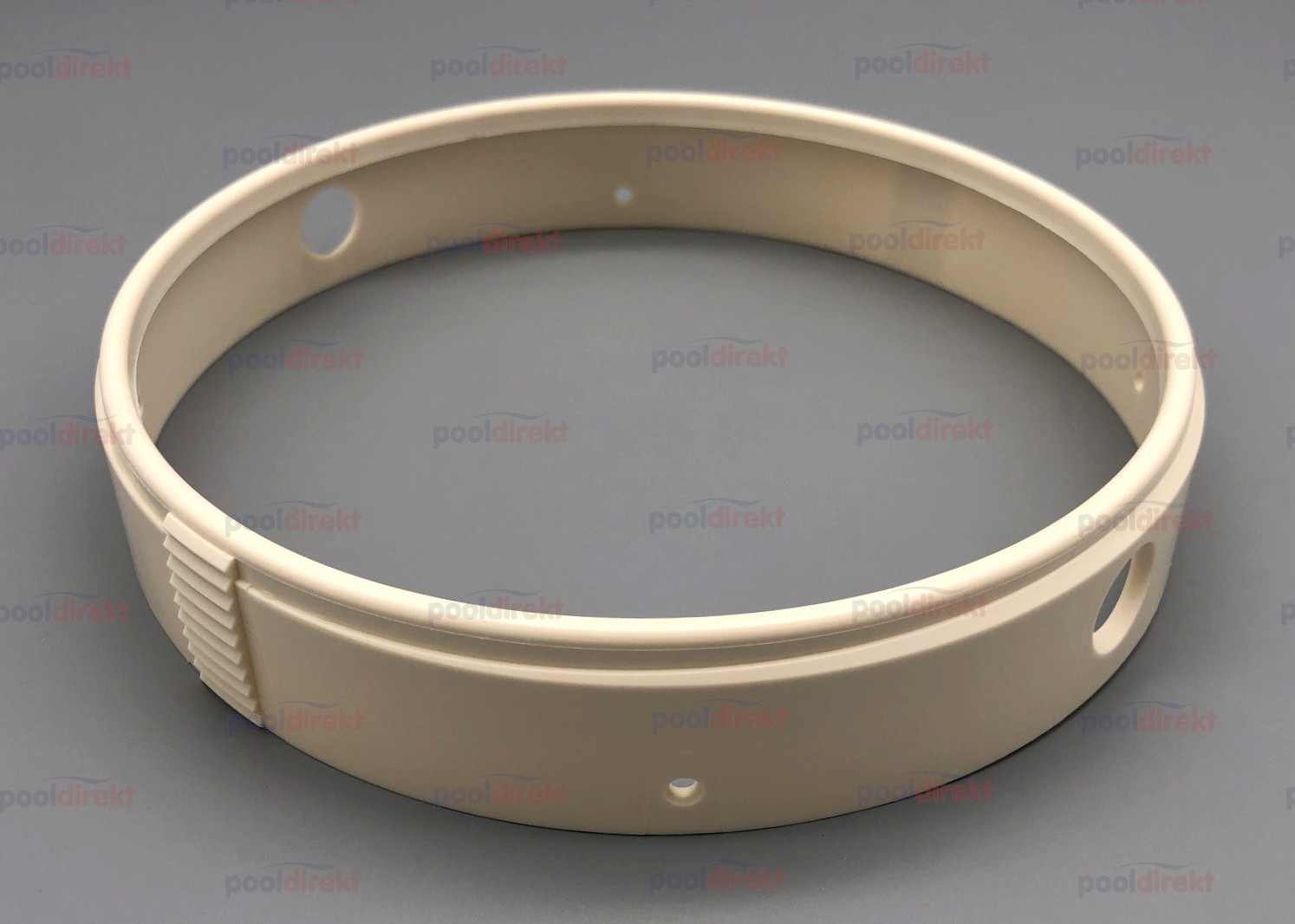 Birnenring in cremeweiß als Ersatzteil zum MTS Unterwasserscheinwerfer. 2 große Löcher zum Einrasten in die Blende (rund oder quadratisch), Rippen gegenüber zum Verstellen des Winkels, 4 kleine Löcher zum Einhängen des Federbügels.