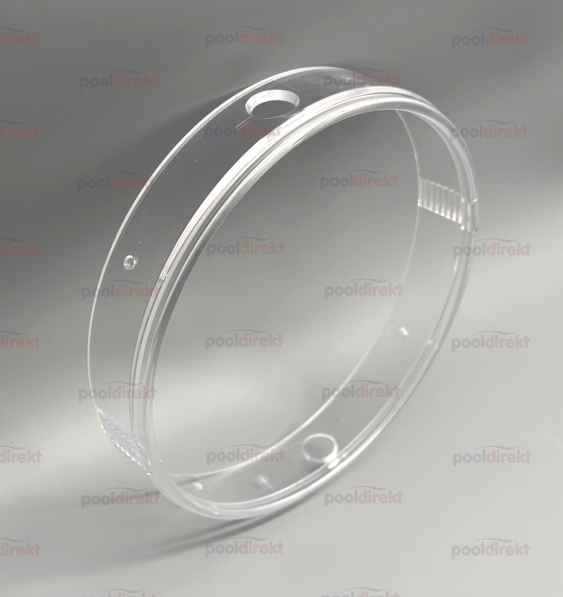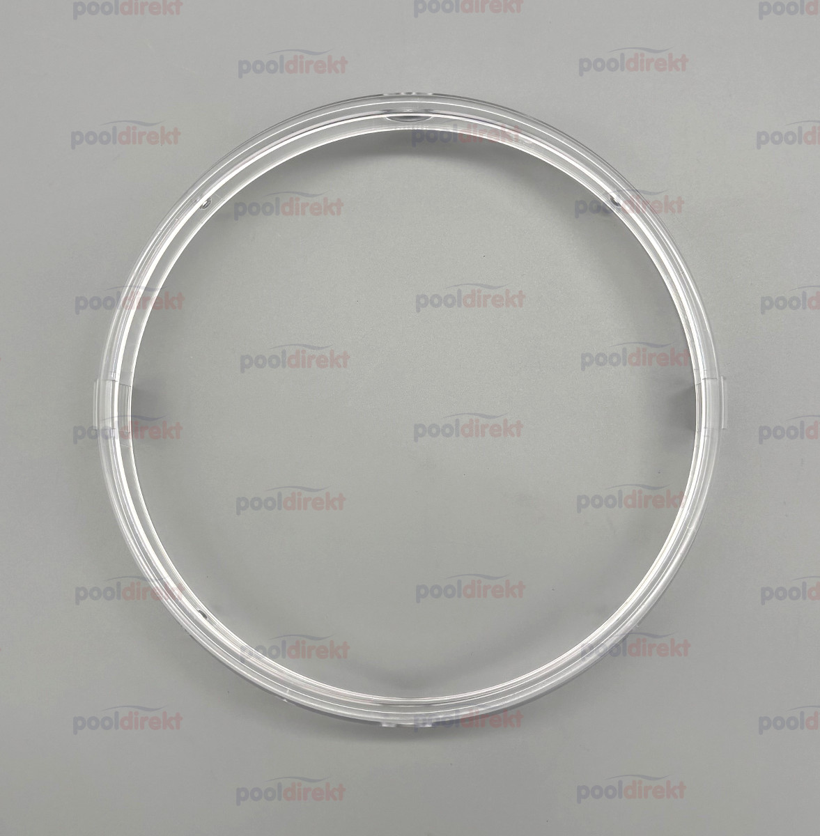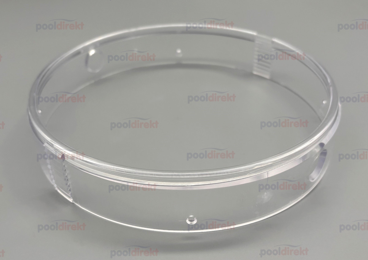 Birnenring in transparent als Ersatzteil zum MTS Unterwasserscheinwerfer. 2 große Löcher zum Einrasten in die Blende (rund oder quadratisch), Rippen gegenüber zum Verstellen des Winkels, 4 kleine Löcher zum Einhängen des Federbügels.
