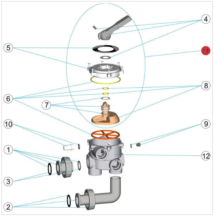 Oberteil für Astral 6-Wege-Ventile 1 1/2" alt inkl. Deckeldichtung und Deckelschrauben mit Muttern. Passt in folgende Ventile: