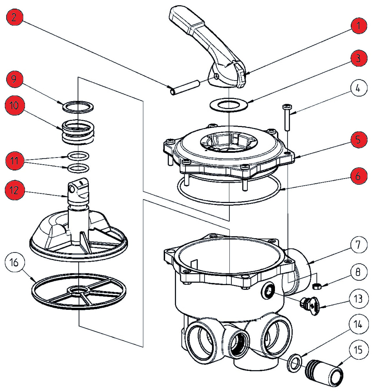 Oberteil Praher 6-Wege-Ventil 1 1/2" V6 alte Version (Sterndichtung liegt im Unterteil) aus ABS als Ersatzteil.