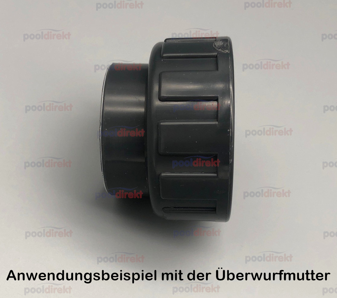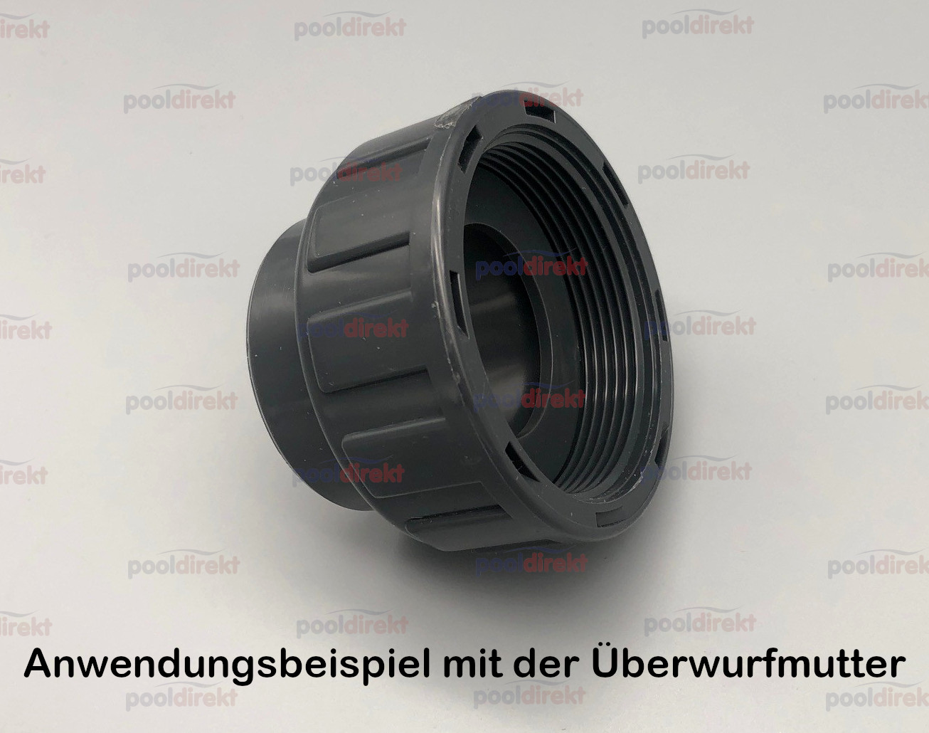 Mit der Überwurfmutter 2 1/4" und dem Einlegeteil können Sie Ihre Astral Sena Pumpe an Ihre DA 50 Verrohrung anschließen. In das Einlegeteil wird das 50er Druckrohr eingeklebt und dann mittels Überwurfmutter an die Pumpe geschraubt.