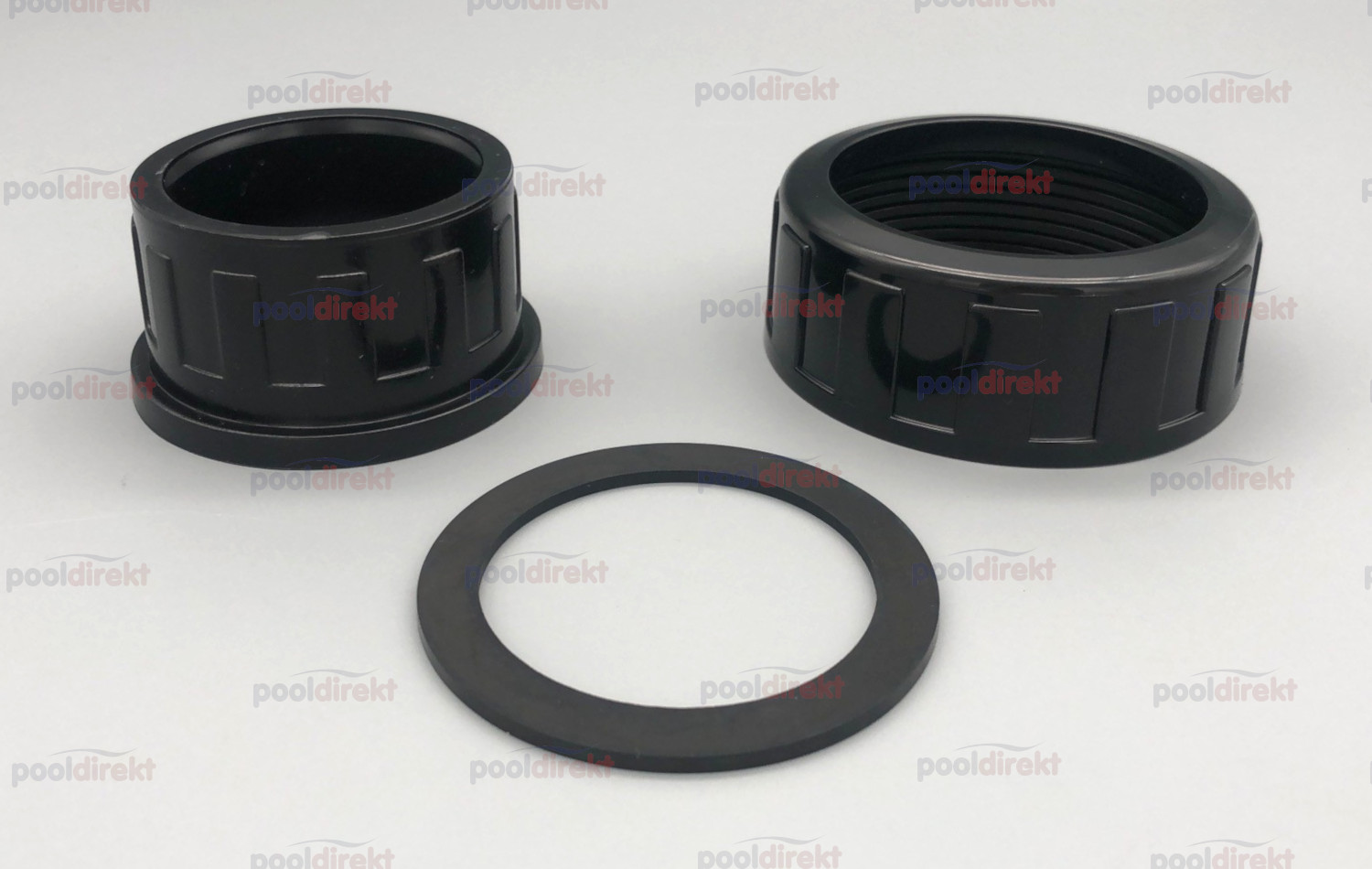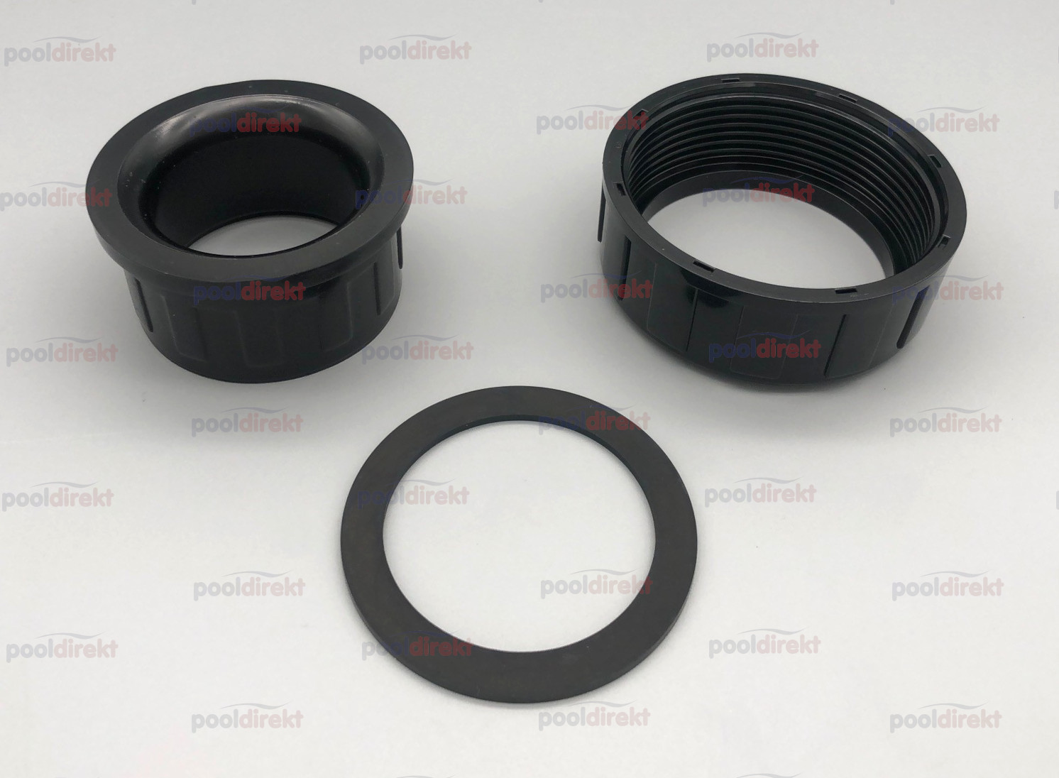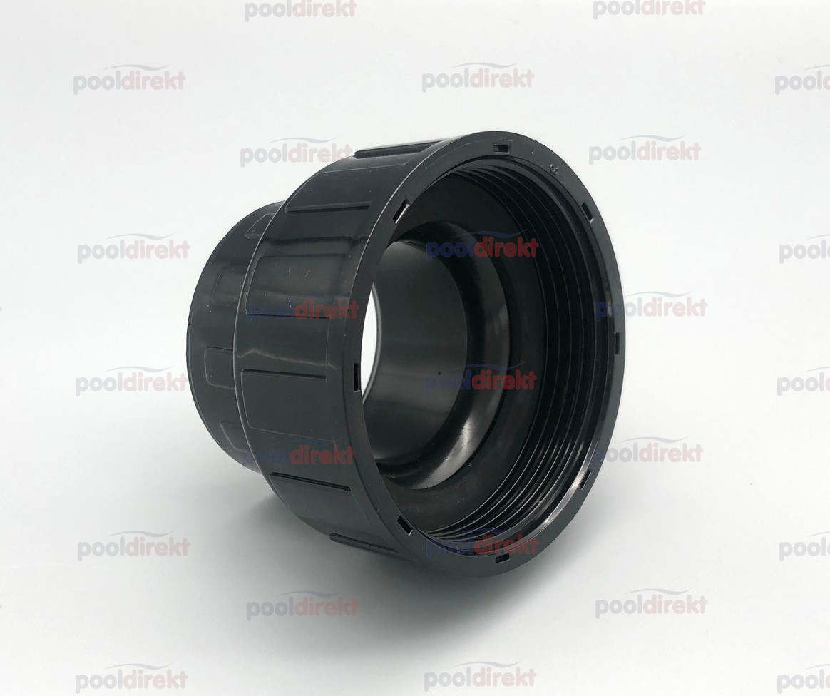 Zum Verbinden der Pumpe mit der Schwimmbad-Verrohrung sowohl an der Saug-, als auch an der Druckseite. In das Einlegeteil kleben Sie Ihre DA50 Verrohrung ein (schieben Sie vorher die Überwurfmutter über das Rohr). Die Flachdichtung wird zwischen Pumpe und Einlegeteil gelegt und mittels Überwurfmutter eingequetscht.