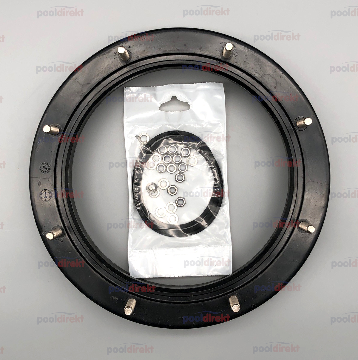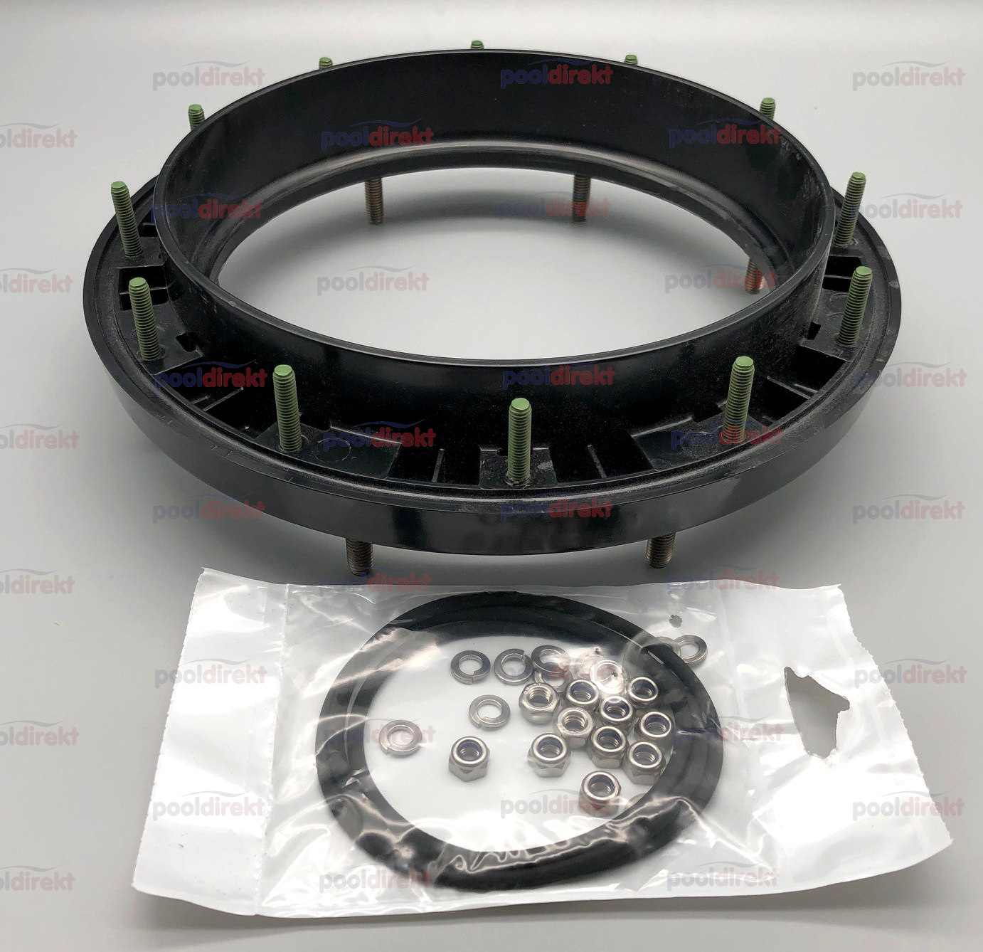 Set enthält 12 Muttern, 12 Sprengringe und O-Ring 255 x 5 mm zum Aufsetzen und Festschrauben auf den Kessel. Die 8 Stehbolzen oben sind für den Deckelflansch - siehe Zubehör.