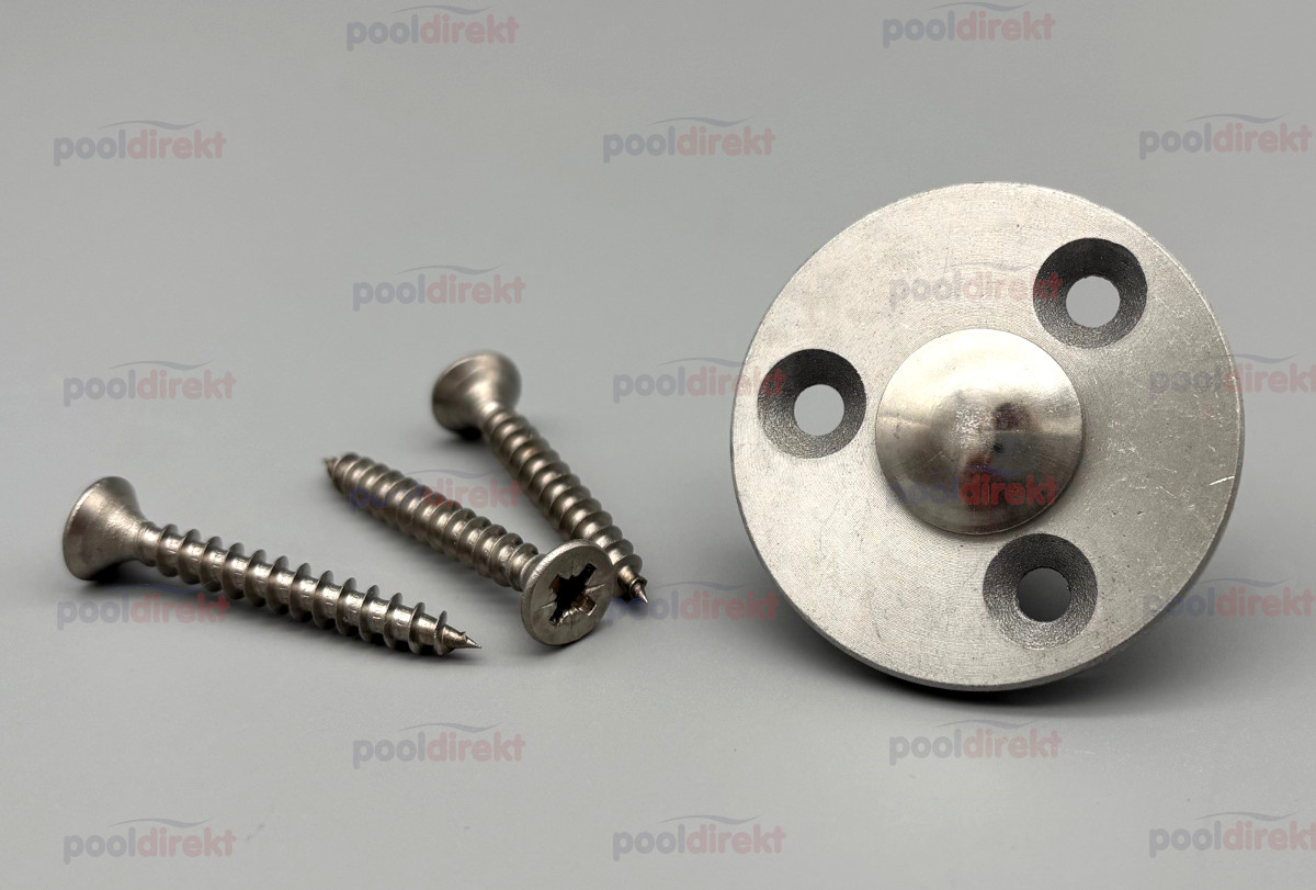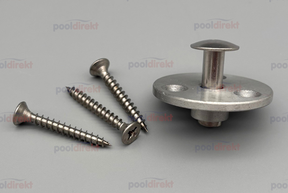 Herausziehbarer Edelstahl-Stift mit Hülse für Holzterrasse, mit 3 Edelstahlschrauben, zur Befestigung von Poolabdeckungen an der Pool-Umrandung aus Holz.