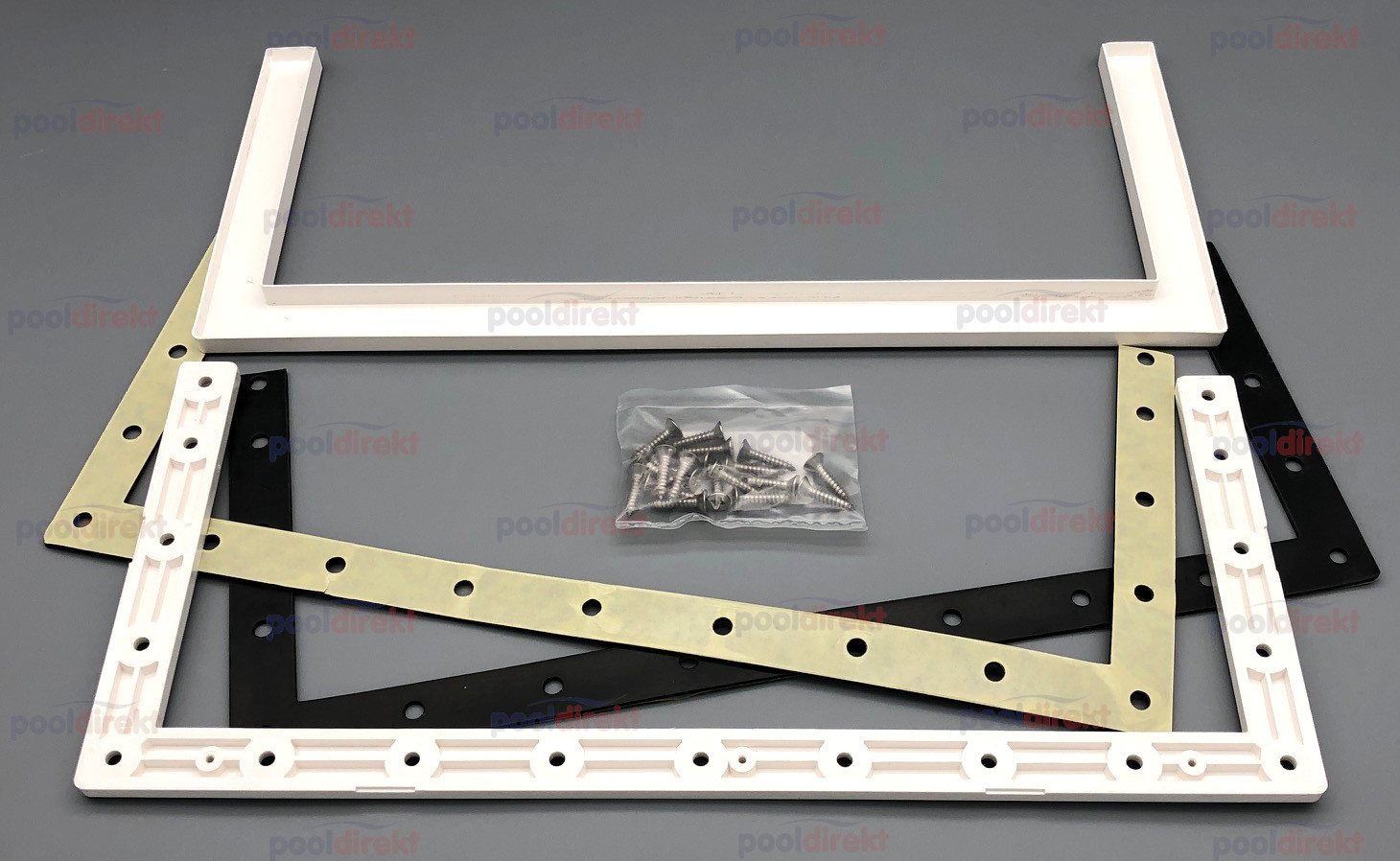 Flansch, 2 Dichtungen zum Aufkleben, Blende und 19 Schrauben 5,5 x 25 für den BWT High Level Skimmer in weiß.