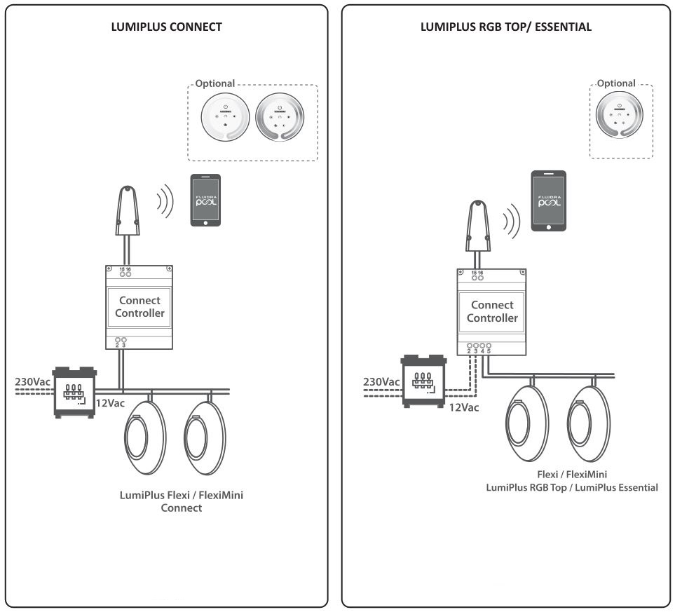 Komplett-Scheinwerfer Astral Lumiplus Connect RGB - steuerbar über die Fluidra Pool Handy-App oder Alexa. Ohne Connect-Controller - bitte extra bestellen - siehe Zubehör. LED Lichtfarbe RGB Blende Farbe weiß 2.000 Lumen 12V, 34,5W 2,5m Kabel 1 Scheinwerfer pro 20-25 m² Pooloberfläche empfohlen bestehend aus Nische 1043106, Kabelschutzschlauch 1042853, Blende und Leuchtmittel Connect RGB (76600M) Birne funktioniert nur mit LumiPlus Connect Controller, muss extra dazu bestellt werden - siehe Zubehör - zum Einschalten wird die Fluidra App benötigt. Volle Kontrolle und Programmierung, egal von wo Einstellungen: Erstellen Sie Ihre persönlichen Profile Erstellung eigener Farben und Farbwechselprofile. Dimmen der Lichtstärke Geschwindigkeitskontrolle für Farbwechsel Sprachsteuerung: Alexa kompatibel WLAN Verfügbarkeit beim Trafo notwendig Optionale Fernbedienung extra erhältlich. Vergessen Sie nicht auf den passenden Trafo und die Kabelanschlußdose - siehe Zubehör!