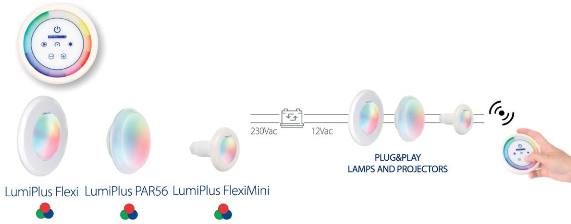- Mit der enthaltenen LumiPlus Plug&Play Fernbedienung können Sie Ihre Poolbeleuchtung steuern (Farbe, Helligkeit, Farbwechselprogramme).