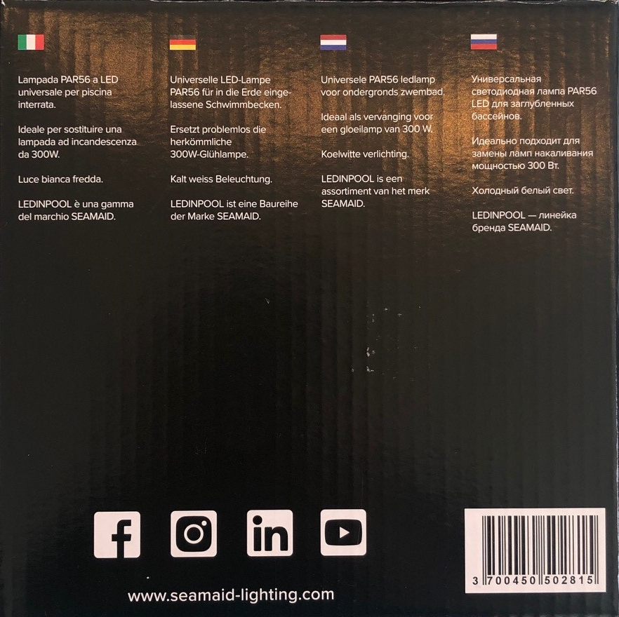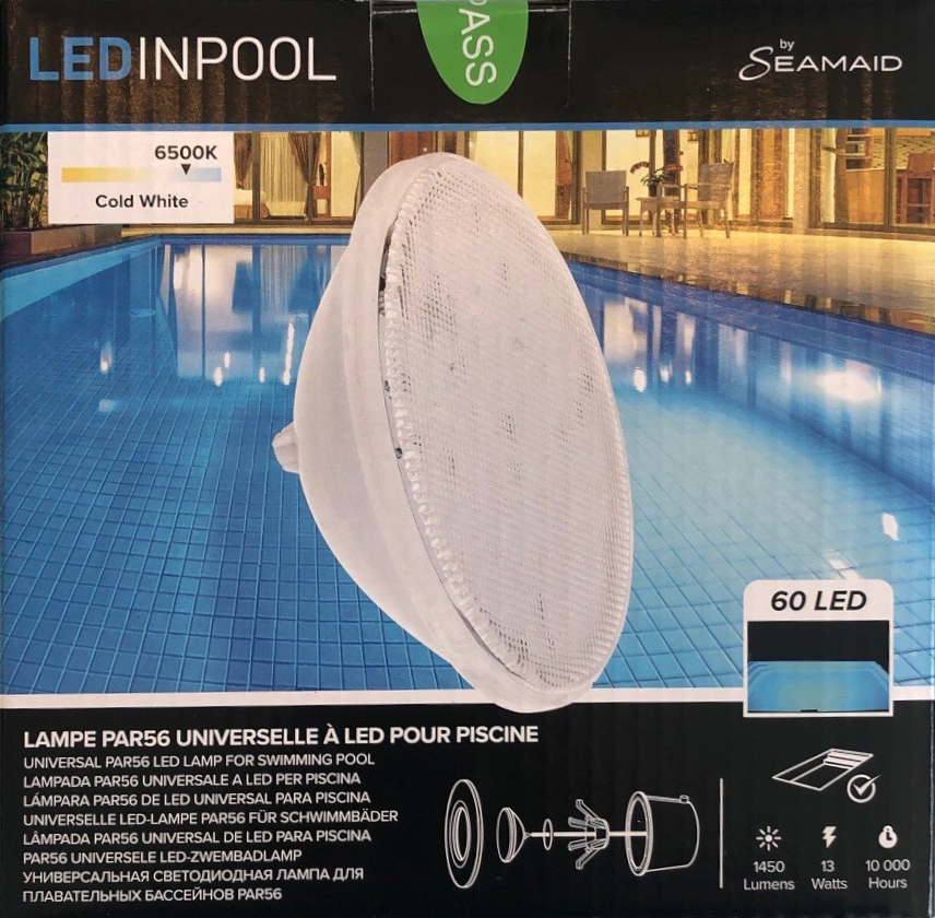 Universelle LED-Lampe PAR56 mit 13 W für in die Erde eingelassene Schwimmbecken als Ersatz für herkömmliche 300 W Glühlampen. Passt in vorhandene Gehäuse und ermöglicht so eine einfache Nachrüstung auf stromsparende LED Pool Beleuchtung.