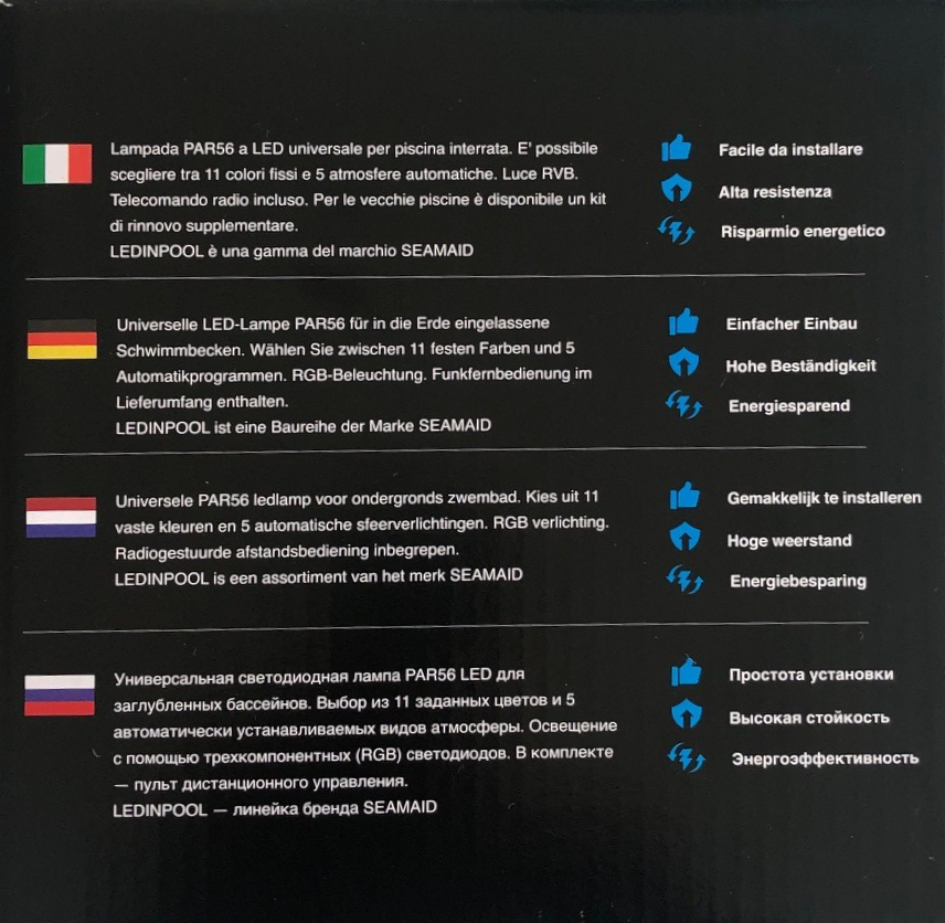 Universelle LED-Lampe PAR56 mit 16 W für in die Erde eingelassene Schwimmbecken als Ersatz für herkömmliche 300 W Glühlampen. Passt in vorhandene Gehäuse und ermöglicht so eine einfache Nachrüstung auf stromsparende LED Pool Beleuchtung.