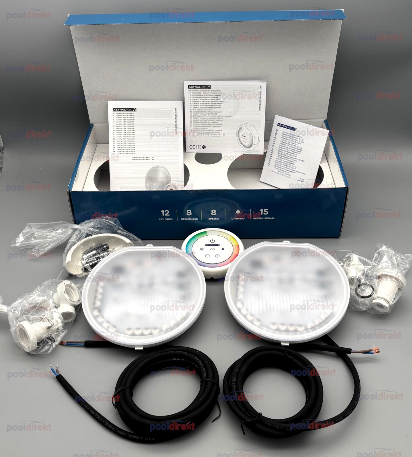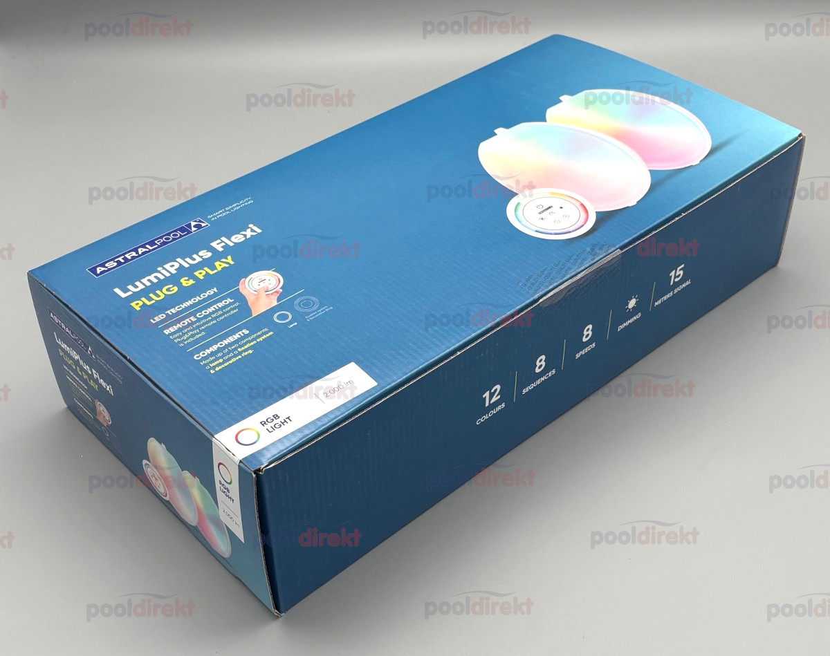 LumiPlus Flexi Plug&Play LED Leuchtmittel mit 2,5 m Kabel mehrfarbig RGB (AC 12V, 34,5W, 2.000 Lumen) zum Befestigen in der Blende - ideal für Sanierungen (ab 2025) inkl. 1 Fernbedienung. Wählen Sie eine Blende dazu, einschrauben - fertig. Mit der enthaltenen LumiPlus Plug&Play Fernbedienung können Sie Ihre Poolbeleuchtung steuern (Farbe, Helligkeit, Farbwechselprogramme). Mit Nische, Kabelschutzschlauch und Blende haben Sie einen kompletten Scheinwerfer. Im Lieferumfang finden Sie 2 Dübel mit Schrauben zur Befestigung der Halterung für die Fernbedienung an einer Wand, sowie 3 Batterien für die Fernbedienung. ACHTUNG - dieses Leuchtmittel lässt sich NUR mit der Plug&Play Fernbedienung steuern, nicht über das Connect-Modul, nicht mit anderen Astral Fernbedienungen! Demonstrationsvideo (YouTube):