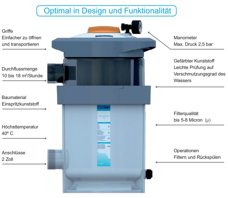 Selbstreinigender Kartuschenfilter mit einer speziellen Kartusche aus Nanofasern mit einer Filterrate von 5 bis 8 Mikrometern. Die NanoFiber-Filterreihe umfasst drei Modelle mit unterschiedlichen Durchflussraten, je nach Kartusche, für drei Bereiche: 10, 15 und 18 m³/h - entsprechend Poolgrößen bis 50 m³, 75 m³ und 90 m³ und ist dabei sehr platzsparend (Durchmesser: ca. 40 cm, Höhe: ca. 65 cm).