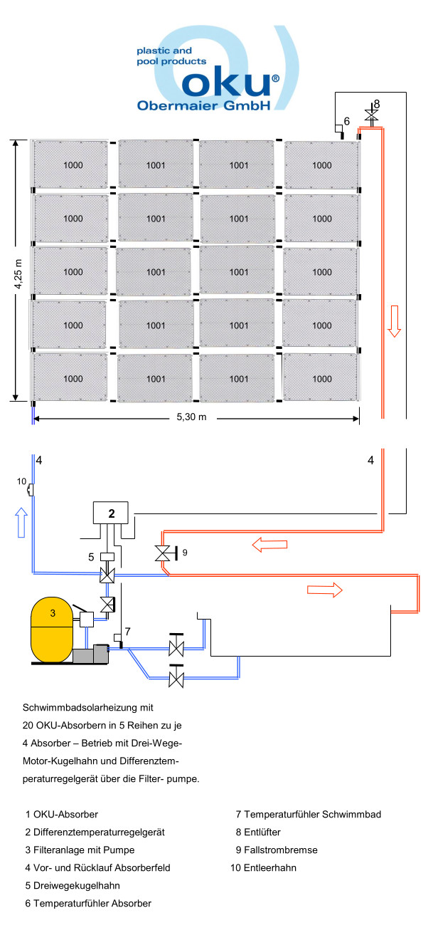 OKU® Schwimmbadsolarheizungen sind äußerst effizient, günstig in der Anschaffung und können in der Regel mit der vorhandenen Poolpumpe der Sandfilteranlage betrieben werden. Dies bedeutet, dass in solchen Fällen keine weiteren Stromkosten anfallen und mit den Solarkollektoren Ihr Pool umweltfreundlich beheizt wird.