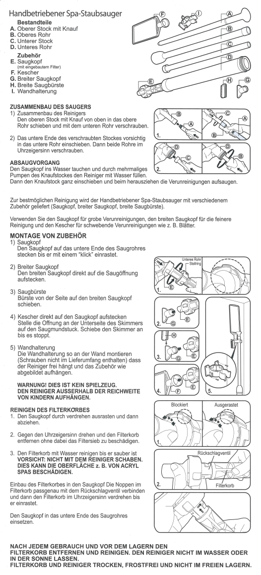 Saugen Sie mit diesem Spa Staubsauger Schmutz, Blätter, Insekten, etc. durch manuelles Pumpen in den Edelstahl-Filterkorb. Ein transparenter Einsatz ermöglicht Ihnen zu sehen, wenn der Filter voll ist und entleert werden sollte.