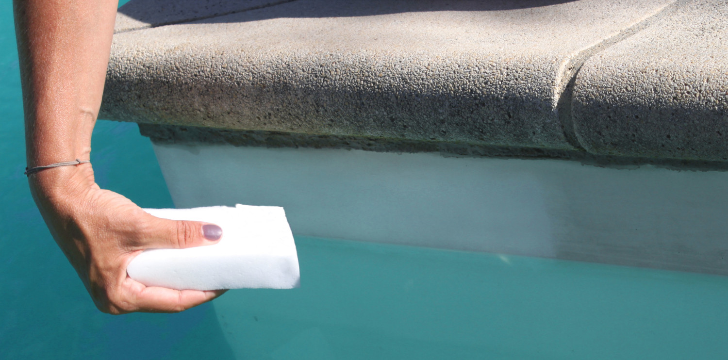 Nur durch Reibung entfernt Pool'Gom® alle Spuren und hartnäckigen Flecken von Kunststoffen ohne Zufügung von Seifen, Bleichmitteln oder anderen chemischen Substanzen… vor allem an der Wasserkante von Folienbecken, aber auch auf allen anderen Kunststoffen in und um das Schwimmbad herum: Skimmer, Jalousien, festen Abdeckungen, Treppen, Gartenmöbeln…