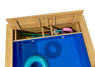 Die Massivholzpools Pool’n Box Junior sind unter dem Handlauf mit einer geräumigen Box zur Aufbewahrung von automatischen Reinigern,Schwimm-Zubehör und Wasserspielzeug versehen - damit nichts mehr herumliegt und die Poolumgebung immer sauber und einladend wirkt. Und so ganz nebenbei haben die Massivholzpools Pool’n Box Junior auch noch einen äußerst attraktiven Preis.