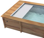 Dieser Anbau zur Unterbringung der Schwimmbad-Technik besteht aus 28 mm dicken Holzbohlen. Die Klappe hat das gleiche Profil wie die Beckenumrandung des Pools; sie ist - gemäss der Sicherheitsnorm NF P 90-308 - mit Scharnieren versehen und abschliessbar. Der Technikraum- Anbau wird in einer Ecke des Pools angebracht und beherbergt die elektrischen Komponenten der automatischen Abdeckung sowie die Filtration. Bei ganz oder teilweise eingelassenen Becken ist ein Technikraum-Anbau unbedingt erforderlich.