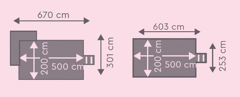 - Äussere Beckenmasse mit Technikraum: 669,5 x 301,4 cm