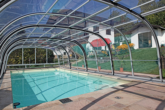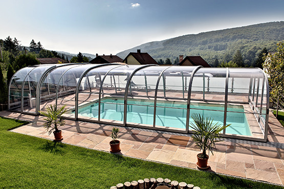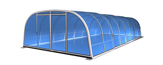 Die Schwimmbadüberdachung Classic passt fast zu jedem Schwimmbad. Die einfache und aerodynamische Form sichert hohe Widerstandsfähigkeit gegenüber äußeren Witterungseinflüssssen, vor allem Regen und Schnee. Classic ist somit auch für höher gelegene Berggebiete geeignet.