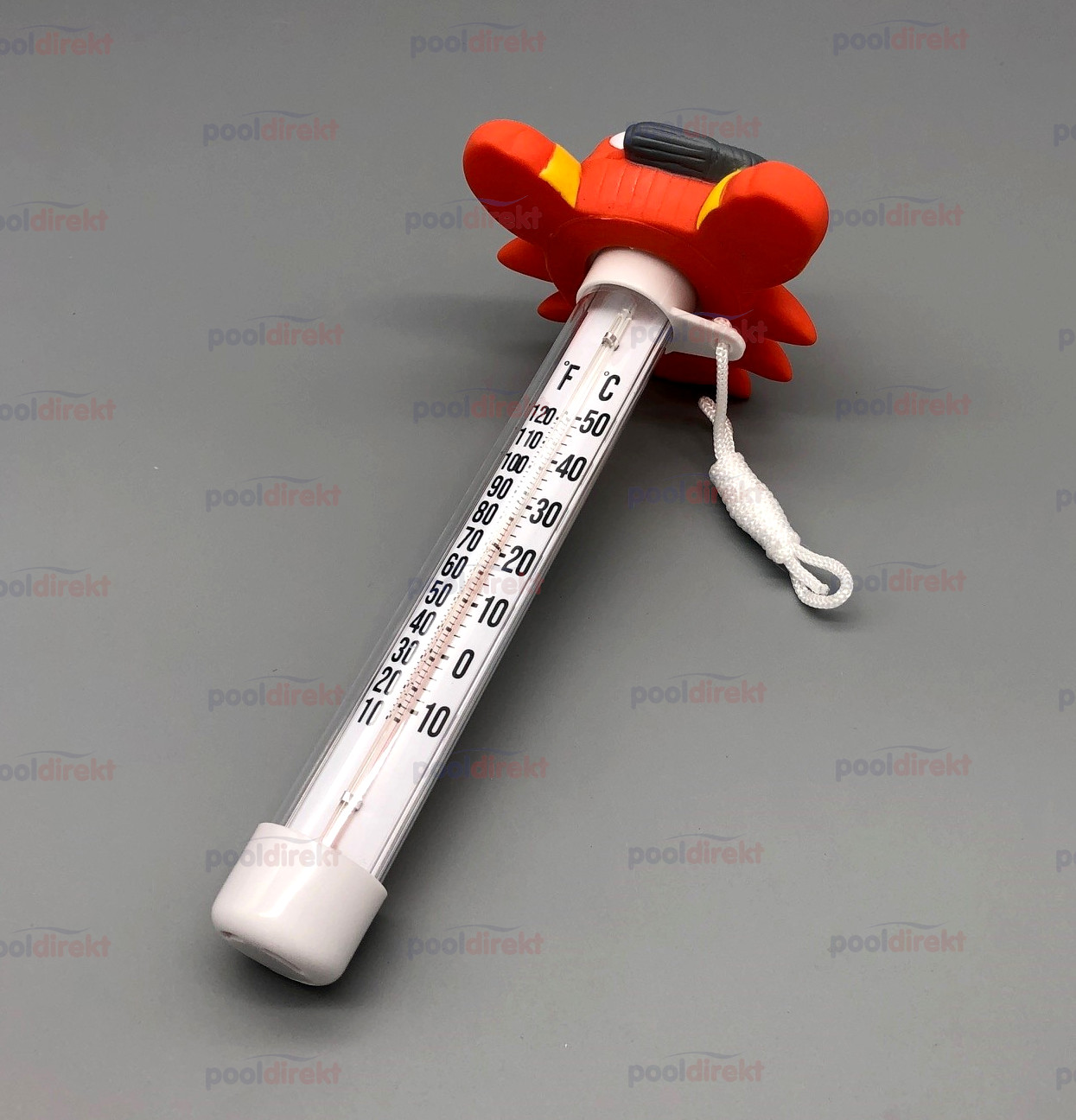 Pool-Thermometer mit Krabbe in orange inkl. Befestigungskordel, salzwassergeeignet.