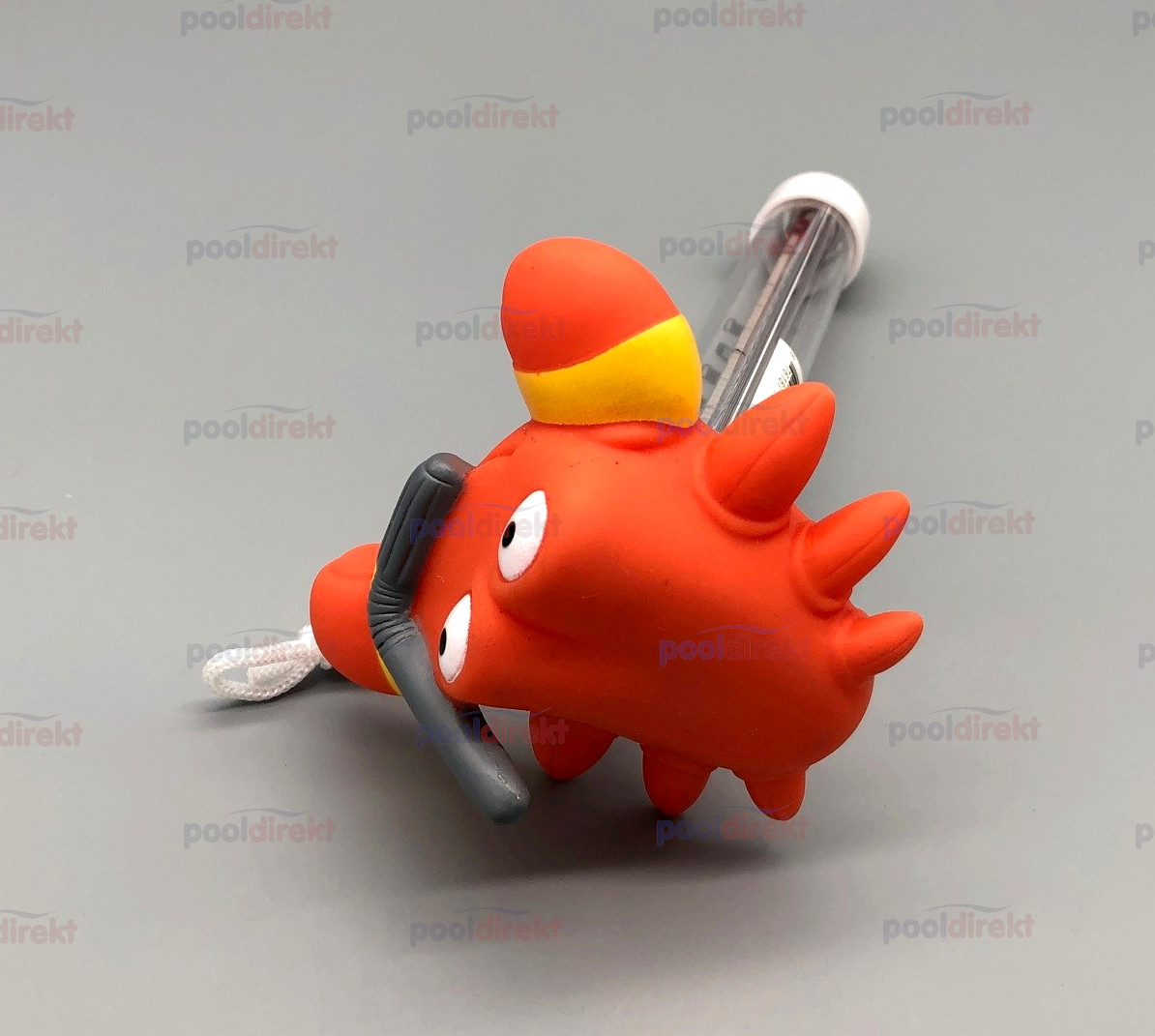 Lassen Sie eine orange Krabbe mit Schnorchel in Ihrem Pool schwimmen! Zum Ablesen der Pool Temperatur ziehen Sie das Thermometer aus dem Wasser.