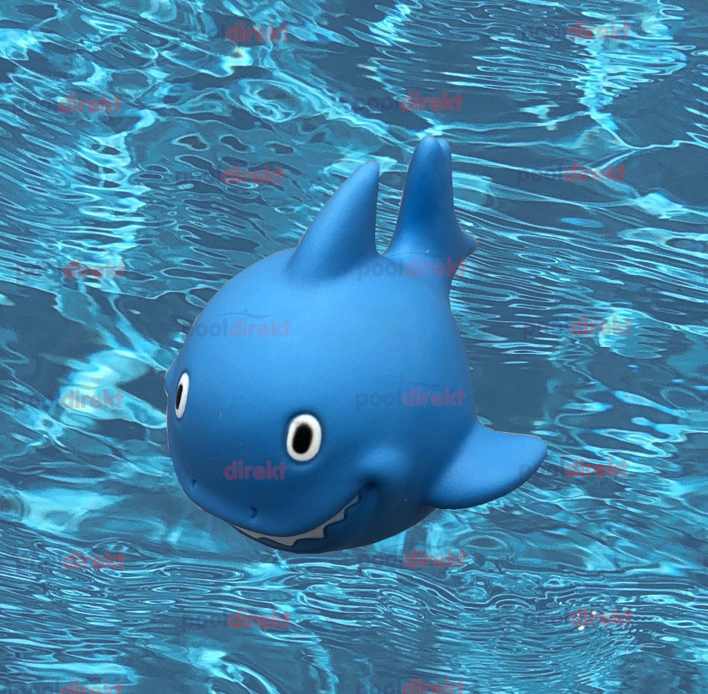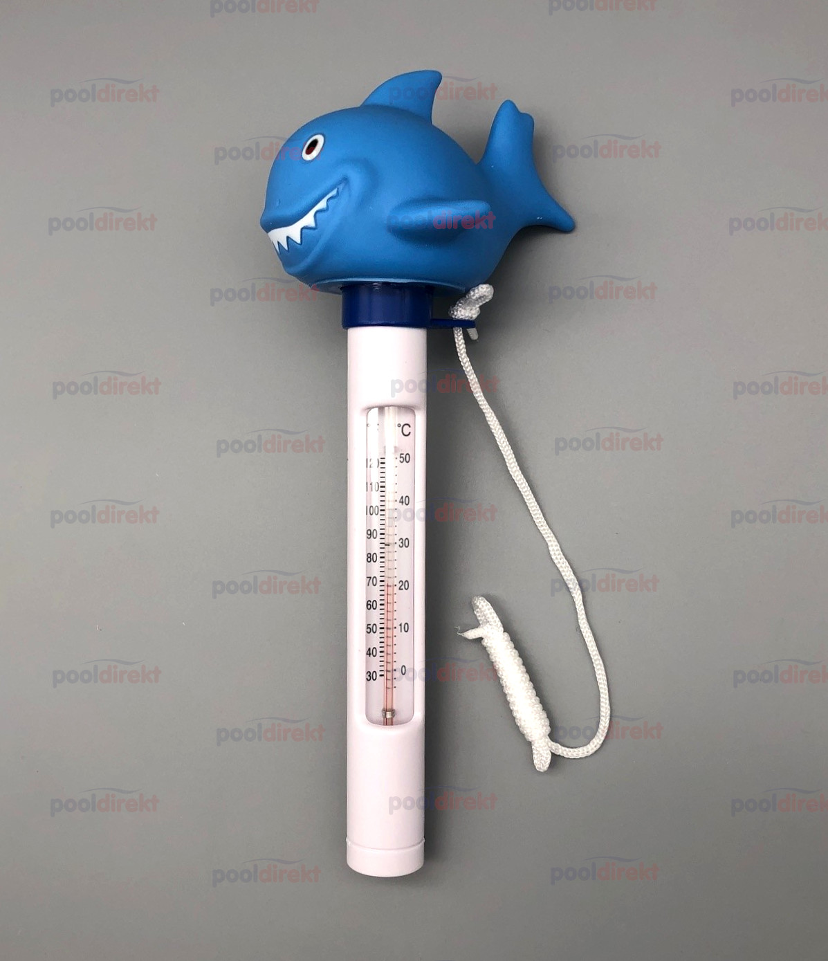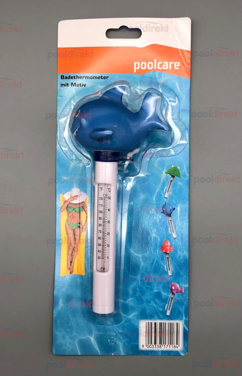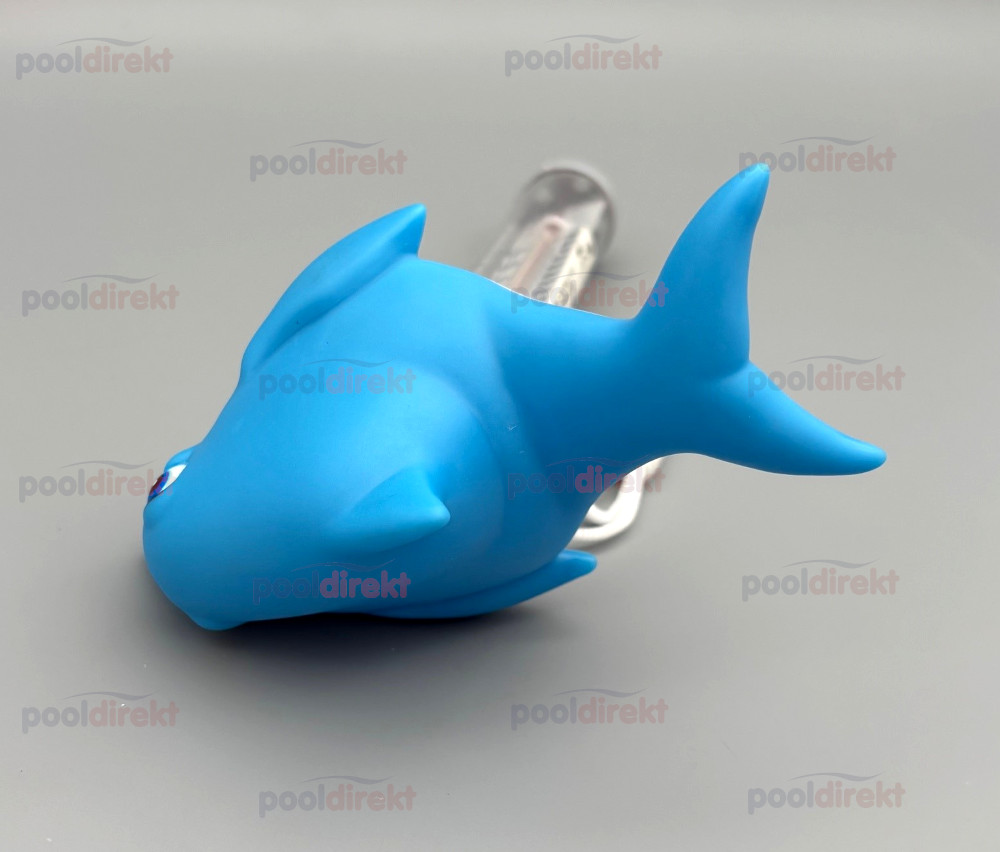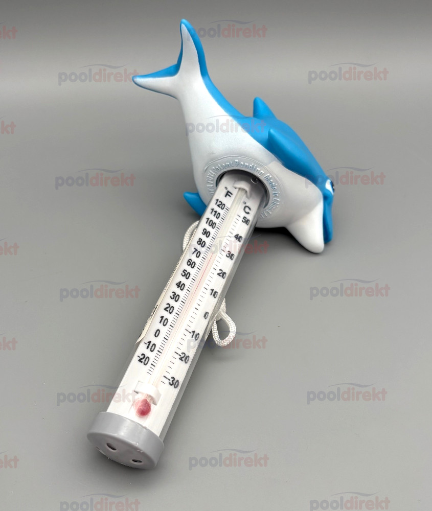 Pool-Thermometer mit Delfin in blau als Schwimmboje. Thermometerskala in °C und °F. Inkl. Kordel zur Befestigung.
