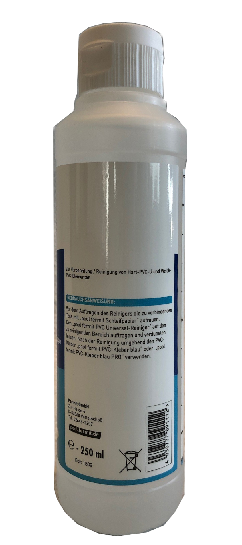 Für die Vorbereitung/Reinigung aller gängigen Kunststoff- und Metalloberflächen (PVC-U, Weich-PVC, PVC-C, ABS Kupfer, Gusseisen, Stahl, verzinkter Stahl,...). Verbessert die Klebeeigenschaften durch Anlösen der Oberflächenschicht. Zur Verwendung mit Pool Fermit PVC-Kleber.