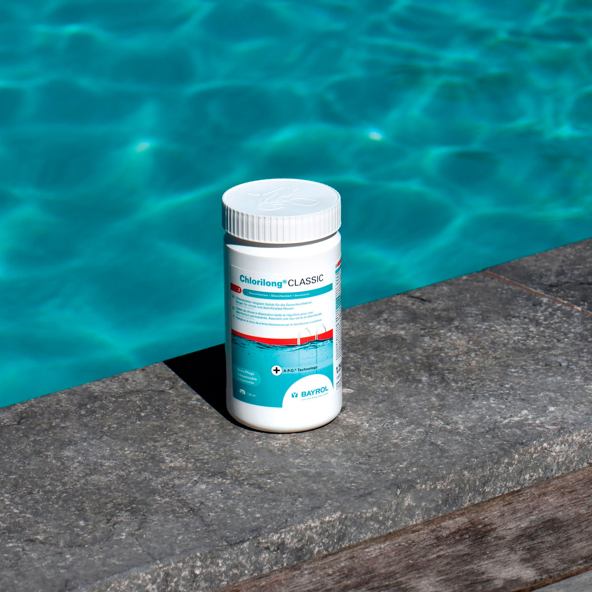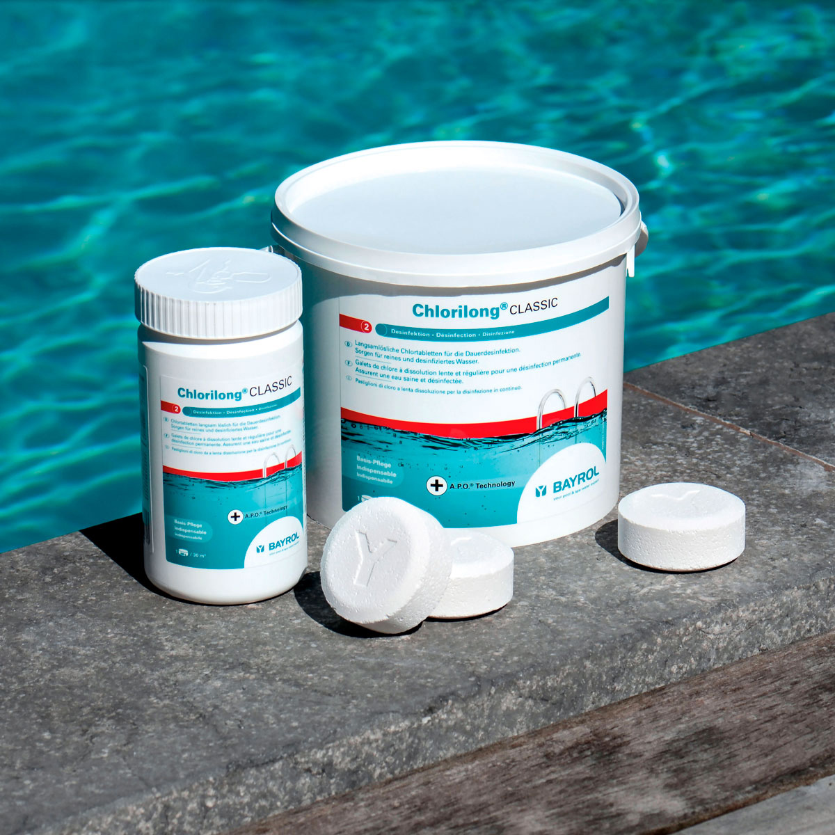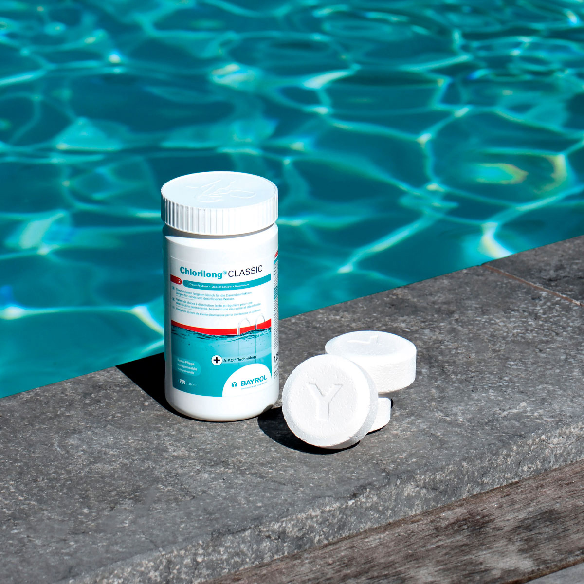 Chlorilong® CLASSIC ist eine langsamlösliche 250 g-Chlortablette für die Dauerdesinfektion zur Eliminerung von Bakterien und Entfernung von Trübungen im Poolwasser. Neben der Verwendung von hochwertigen Rohmaterialien wird bei der Pressung der Chlorilong® CLASSIC- Chlortabletten ein innovatives Verfahren angewendet: die A.P.O.™-Technologie. Diese Technologie stellt sicher, dass sich die Tablette sehr gleichmäßig auflöst und immer eine konstante Menge Chlor an das Wasser abgibt. Dies bietet Ihnen zusätzliche Sicherheit bei der Wasserdesinfektion Ihres Pools.