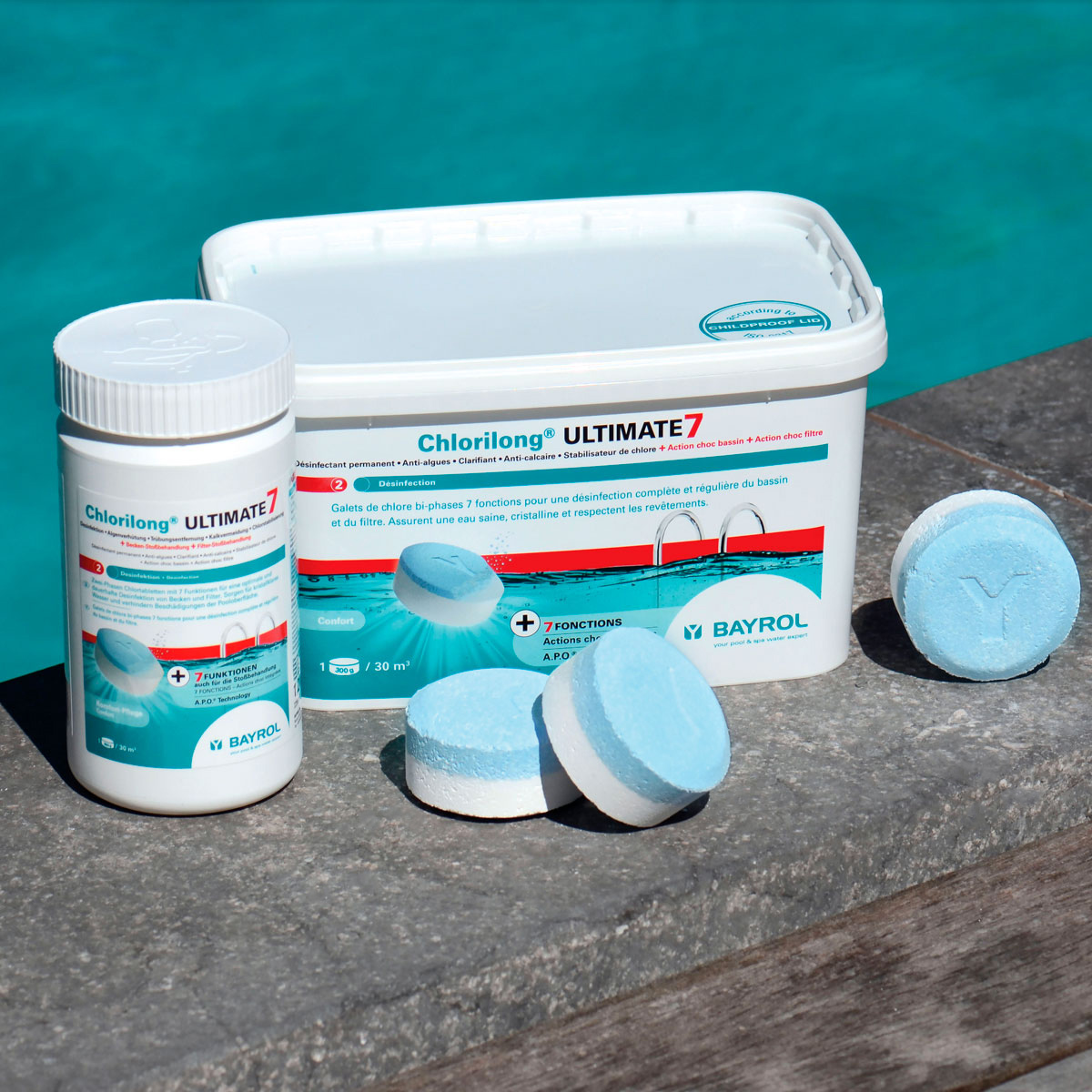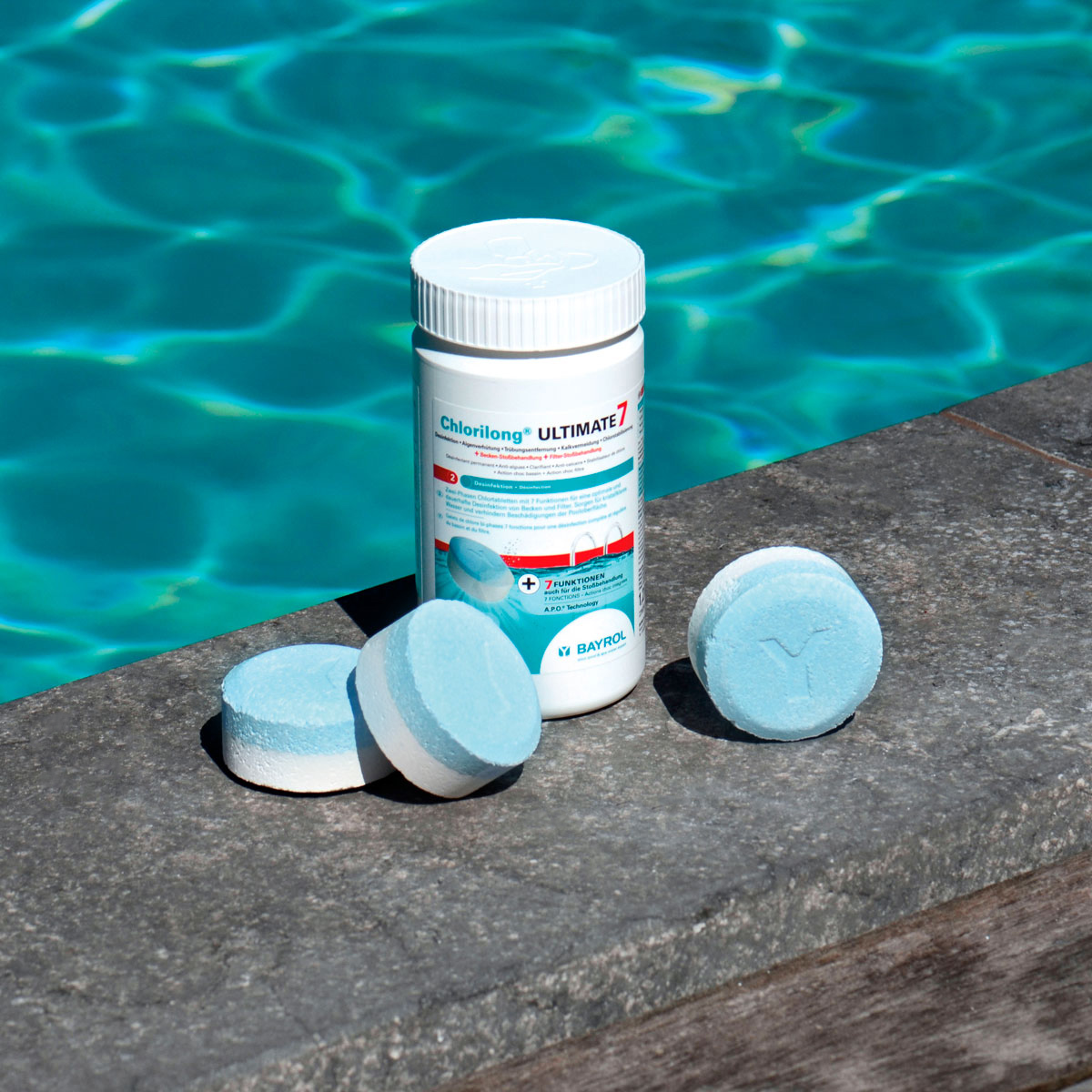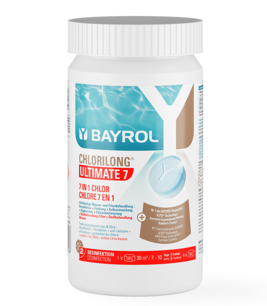 Chlorilong® ULTIMATE7 ist eine 7 Funktionen (Desinfektion • Algenverhütung • Trübungsentfernung • Kalkvermeidung • Chlorstabilisierung + Becken– + Filter-Stoßbehandlung) -Chlortablette (300 g) bestehend aus zwei Phasen mit unterschiedlichen Wirkungsweisen: Der blaue Teil zerfällt in etwa 10 Minuten und lagert sich auf dem Filterbett des Sandfilters ab. Dies bewirkt eine Intensivreinigung und Desinfektion des Filtermaterials. Schmutz und Bakterien werden dadurch sicher entfernt. Der weiße Teil der Tablette ist langsamlöslich und sorgt für eine Dauerdesinfektion. Dank dieser einzigartigen Rezeptur, zusammen mit dem enthaltenen Trübungsentferner, Chlor- und Härtestabilisator bietet die Chlorilong® ULTIMATE7 eine ultimative Wasserpflege für kristallklares Wasser.