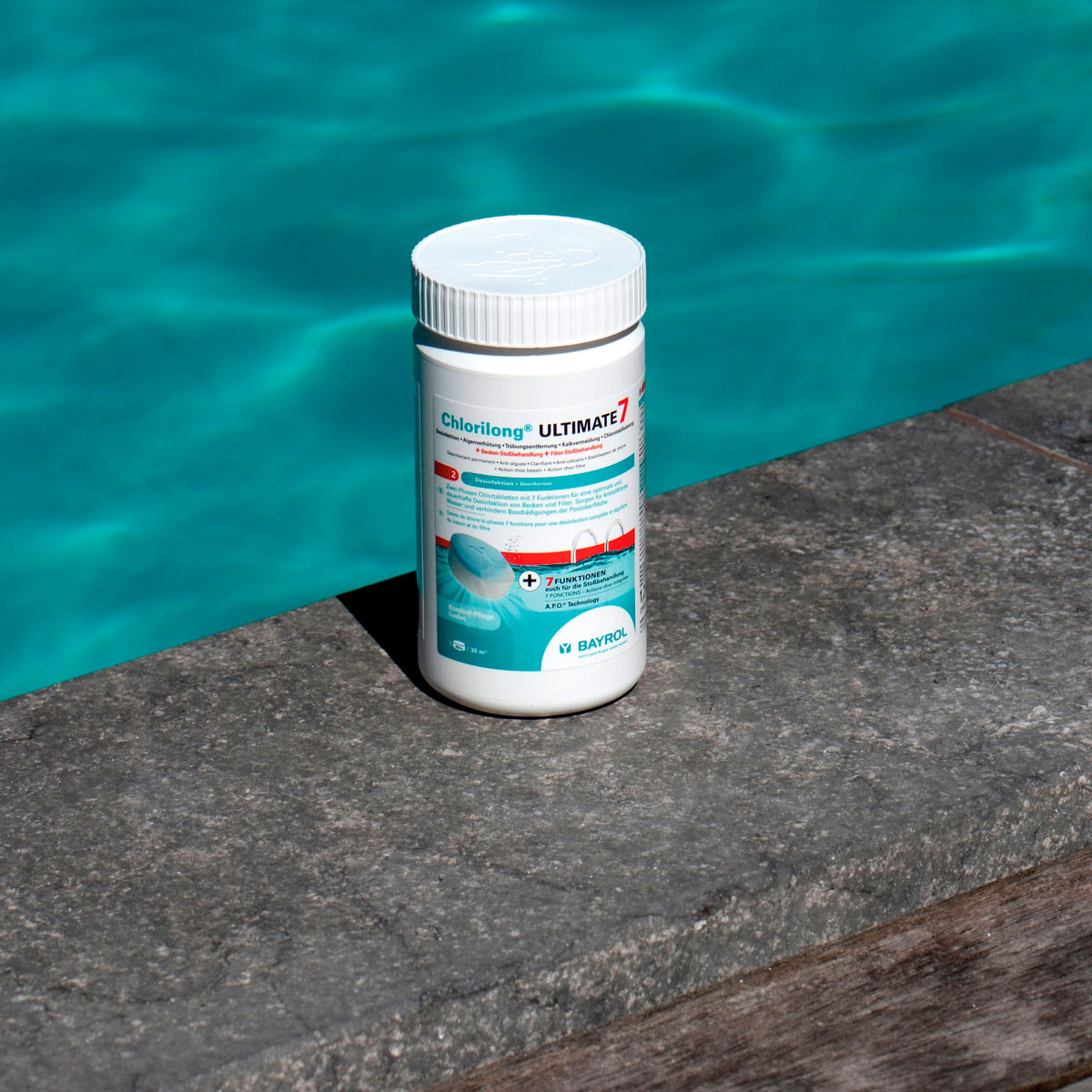 • Der enthaltene Chlorstabilisator wirkt gegen zu schnellen Chlorabbau bei höheren Wassertemperaturen und starker Sonneneinstrahlung.