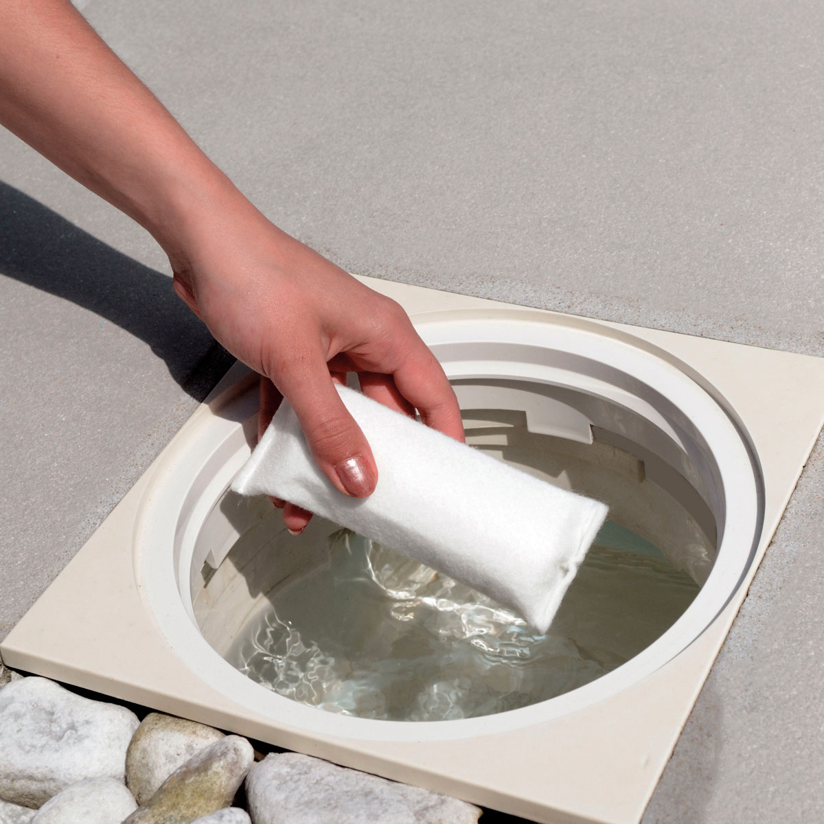 • Bei Überlaufrinnen geben Sie die Kartusche in einen Beutel oder Netz und hängen diesen in den Schwallwasserbehälter.