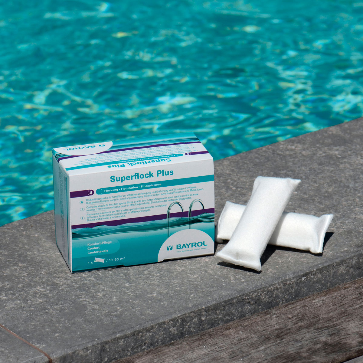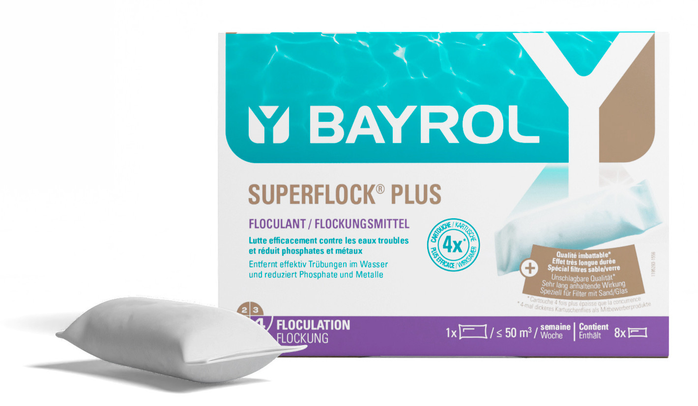 • Falls Ihr Wasser trotz Einsatz von Superflock Plus nicht kristallklar wird, liegt eine zu hohe organische Belastung vor. In diesem Fall führen Sie eine Stoßbehandlung mit Chlorifix®, Chloriklar® oder Chloryte® durch, spülen den Filter ausreichend rück und geben anschließend eine Superflock Plus Kartusche für bis zu 50 m³ in den Skimmer.