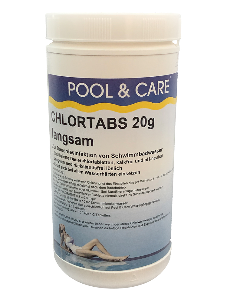 Chlortabletten 20g langsam löslich zur Dauerdesinfektion von Schwimmbadwasser, ideal für kleine Pools, Swim Spas und Whirlpools, auch bei Filterballs und Kartuschenfilter anwendbar.