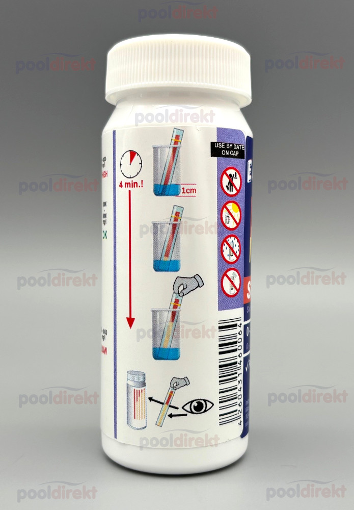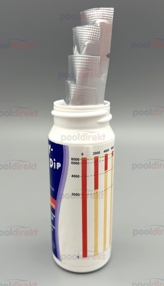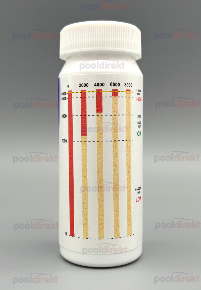 Teststreifen für die schnelle und einfache Bestimmung des Salzgehaltes im Poolwasser bei Anwendung von Salzelektrolyse-Verfahren.