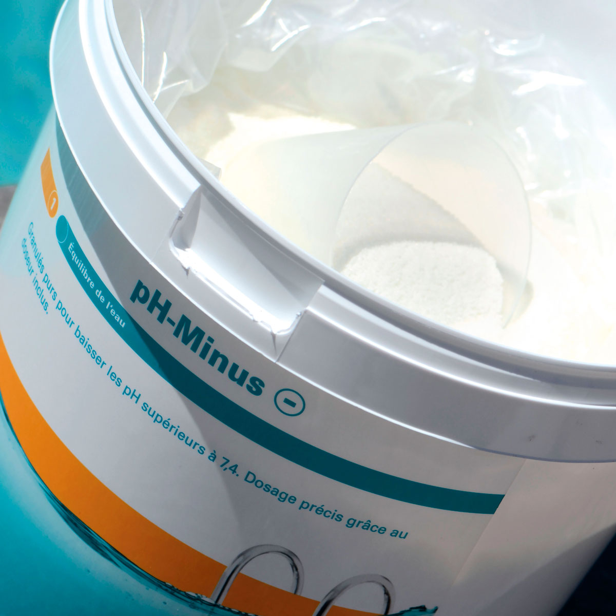 • Um den pH-Wert um 0,1 zu senken, sind 100 g pH-Minus pro 10 m³ erforderlich.