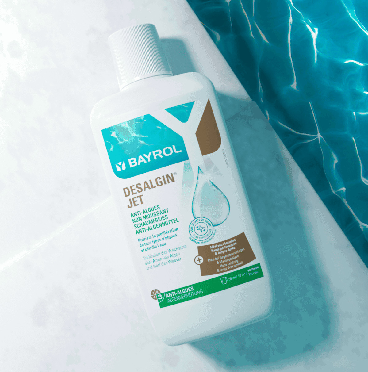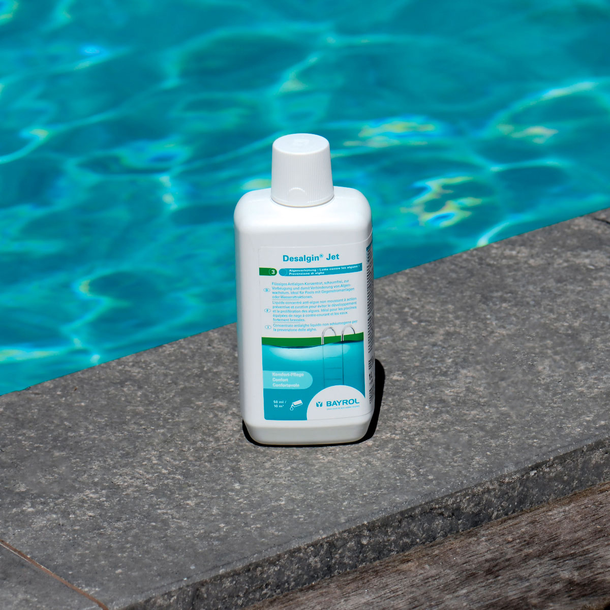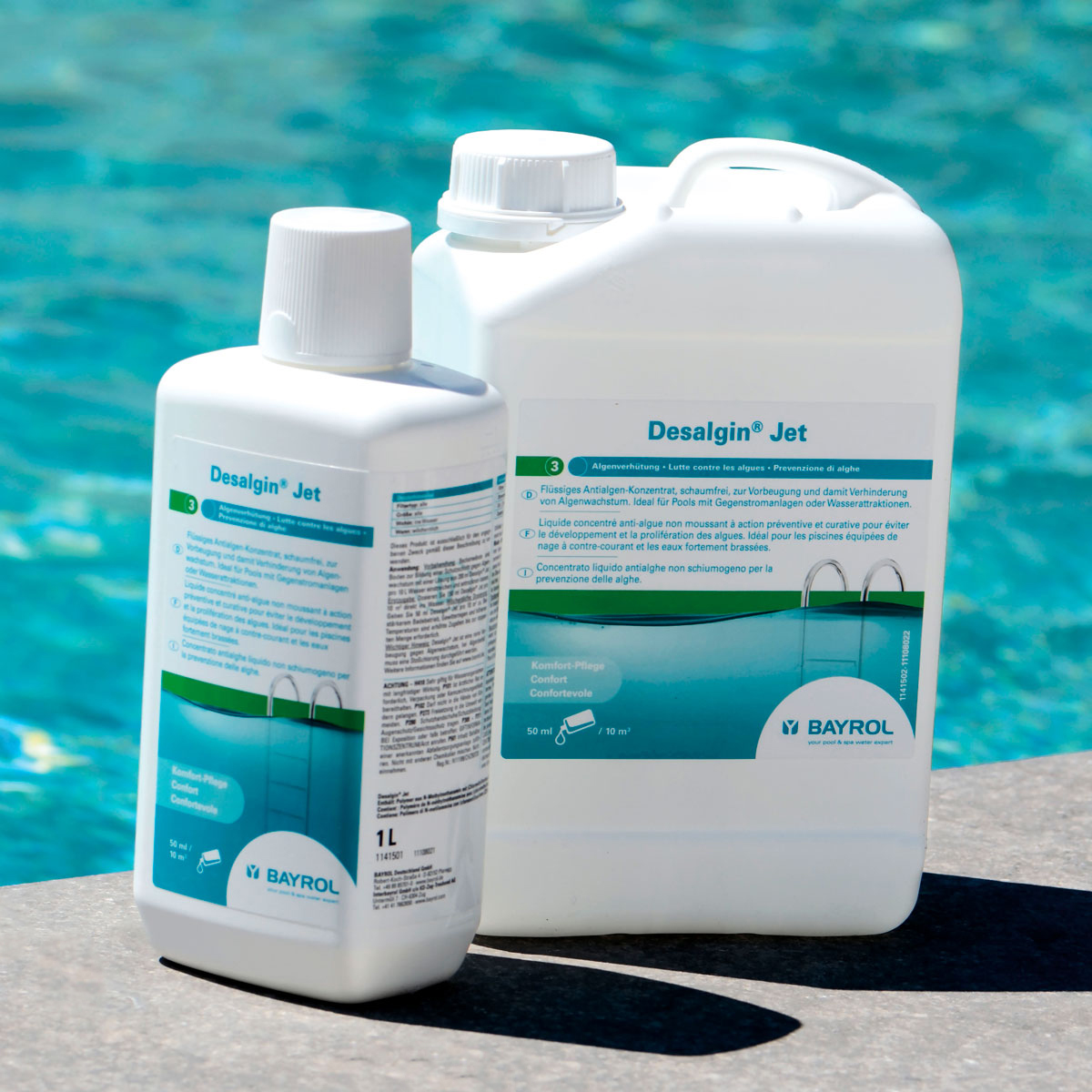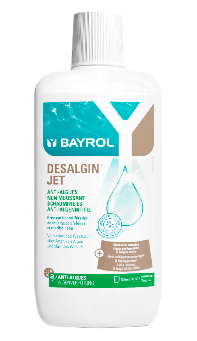 Desalgin® JET ist ein konzentriertes Algizid und verhindert sicher das Wachstum und die Ausbreitung von Algen im Poolwasser. Da Desalgin® JET nicht schäumend ist, eignet es sich hervorragend für den Einsatz in Pools mit Gegenstromanlagen oder sonstigen Wasserattraktionen.