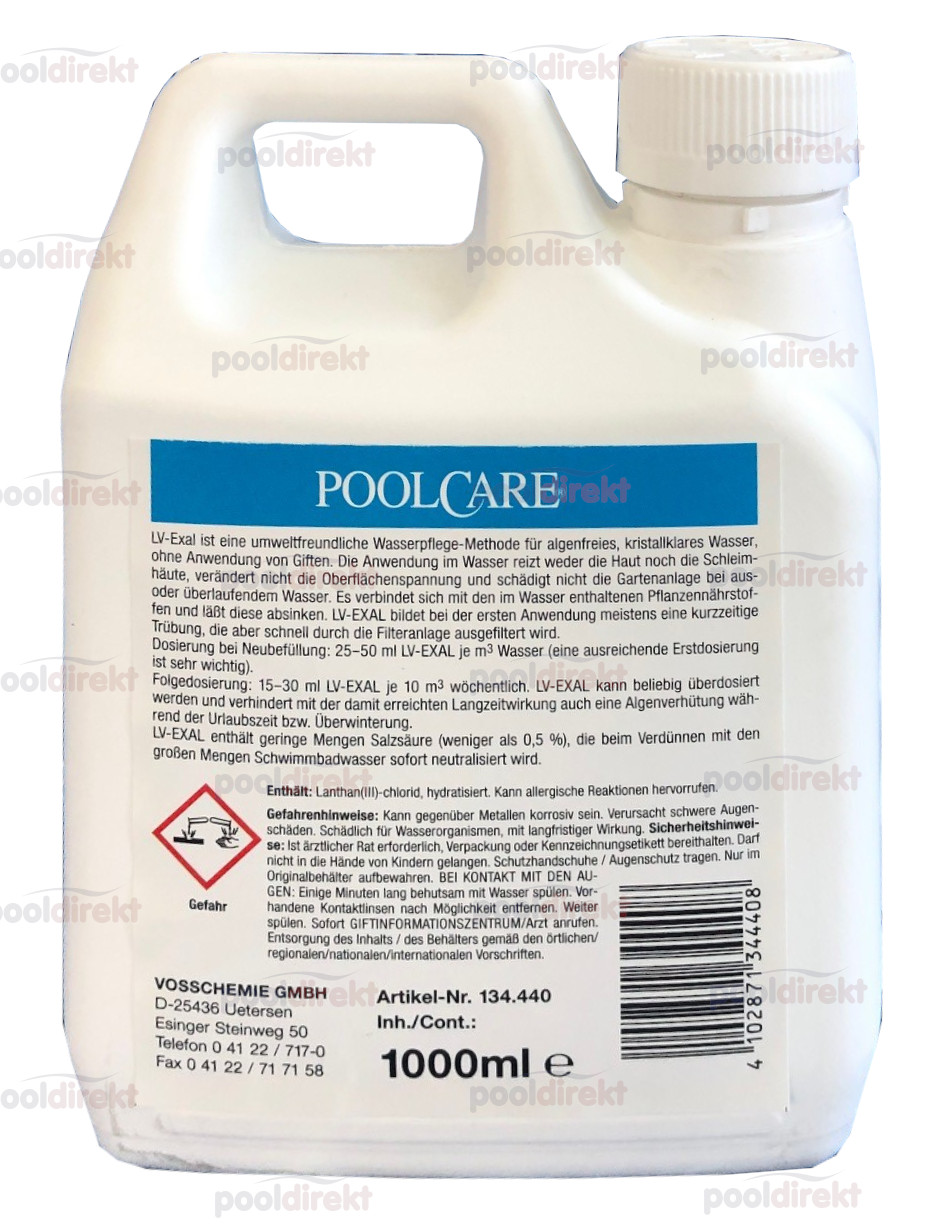 Kann auch in Schwimmteichen eingesetzt werden. Algenwachstum wird durch die Phosphatreduktion verhindert, es ist aber kein Desinfektionsmittel. Besteht aus Lanthan(III)-chlorid hydratisiert, kann allergische Reaktionen hervorrufen. LV-Exal enthält geringe Mengen Salzsäure (weniger als 0,5%), die beim Verdünnen mit den großen Mengen Schwimmbadwasser sofort neutralisiert wird.