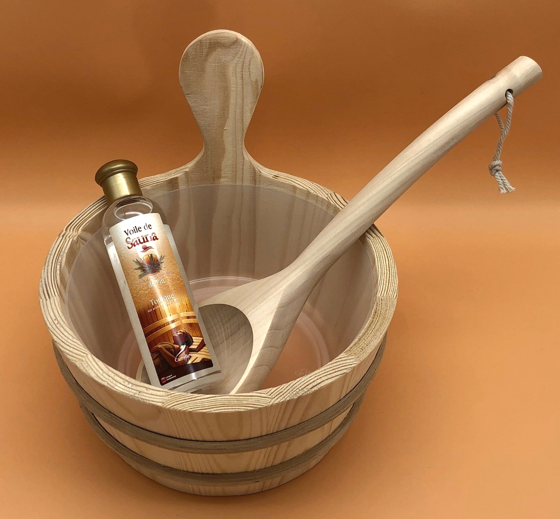 Starter-Set für die eigene Heimsauna oder zum Verschenken, bestehend aus Saunakübel, Kelle und Duft-Konzentrat (wählbar).