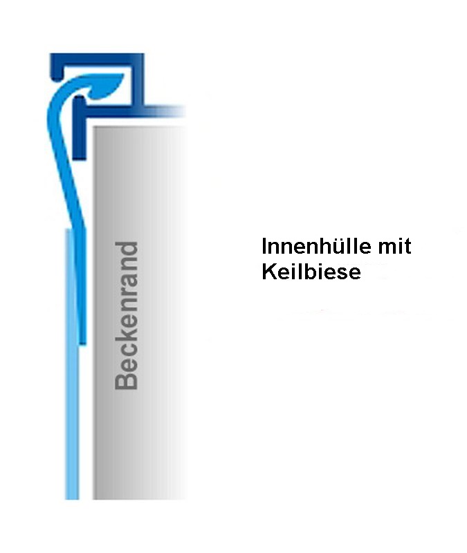 - mit Keilbiese, bei diesen Innenhüllen wird der Keil der Poolfolie in einem Befestigungsprofil an der Innenseite des Funktionshandlaufs verankert (siehe Foto).