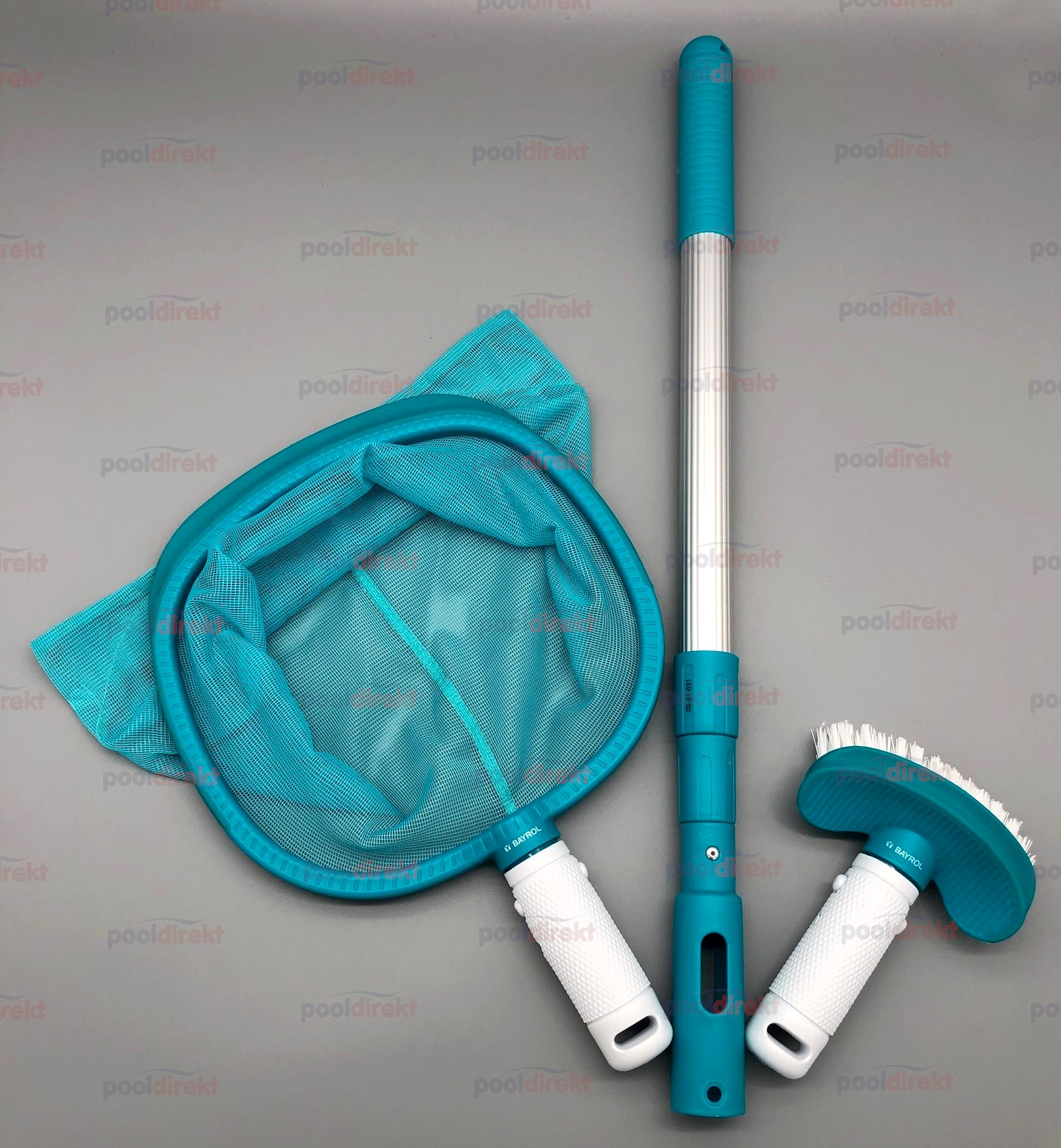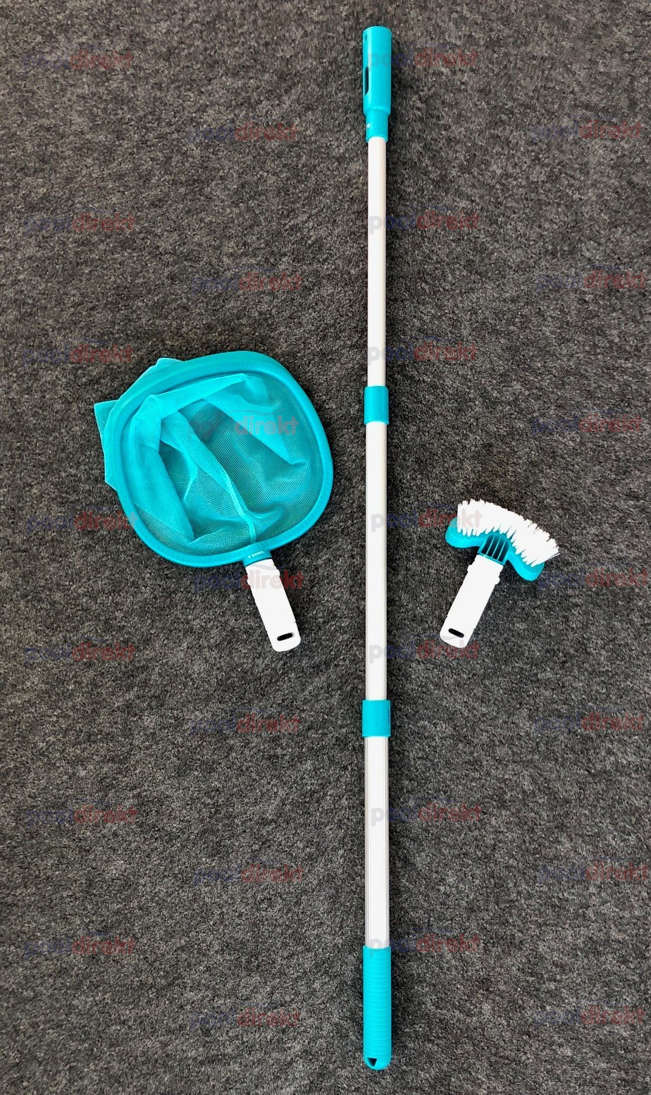 Die weißen Gummigriffe können sowohl von der Bürste, als auch vom Kescher abgenommen werden, um die Teleskopstange zu montieren. Mit montiertem Gummigriff sind Bürste und Kescher auch direkt verwendbar. Auf die Teleskopstange können auch andere Poolzubehörteile montiert werden.