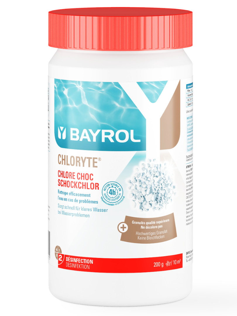 Chloryte® besteht aus anorganischem Chlorgranulat (Calciumhypochlorit) mit 70% Aktivchlorgehalt. Ideal für die Stoßbehandlung bei Problemen mit der Wasserpflege. Chloryte® wirkt sofort gegen Bakterien, Pilze und Algen. Durch die spezielle Granulatform entsteht weniger Staub.
