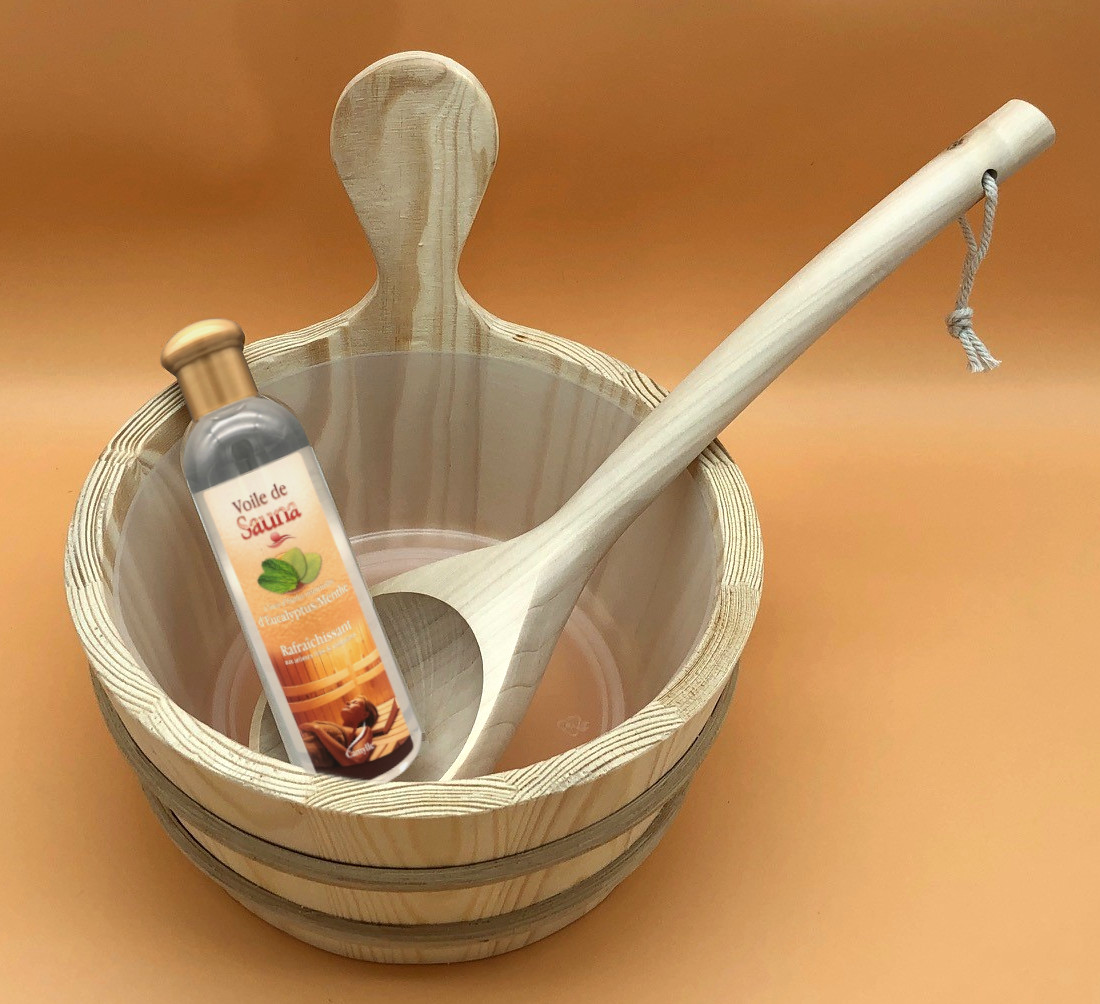 Starter-Set für die eigene Heimsauna oder zum Verschenken, bestehend aus Saunakübel, Kelle und Duft-Konzentrat (wählbar).
